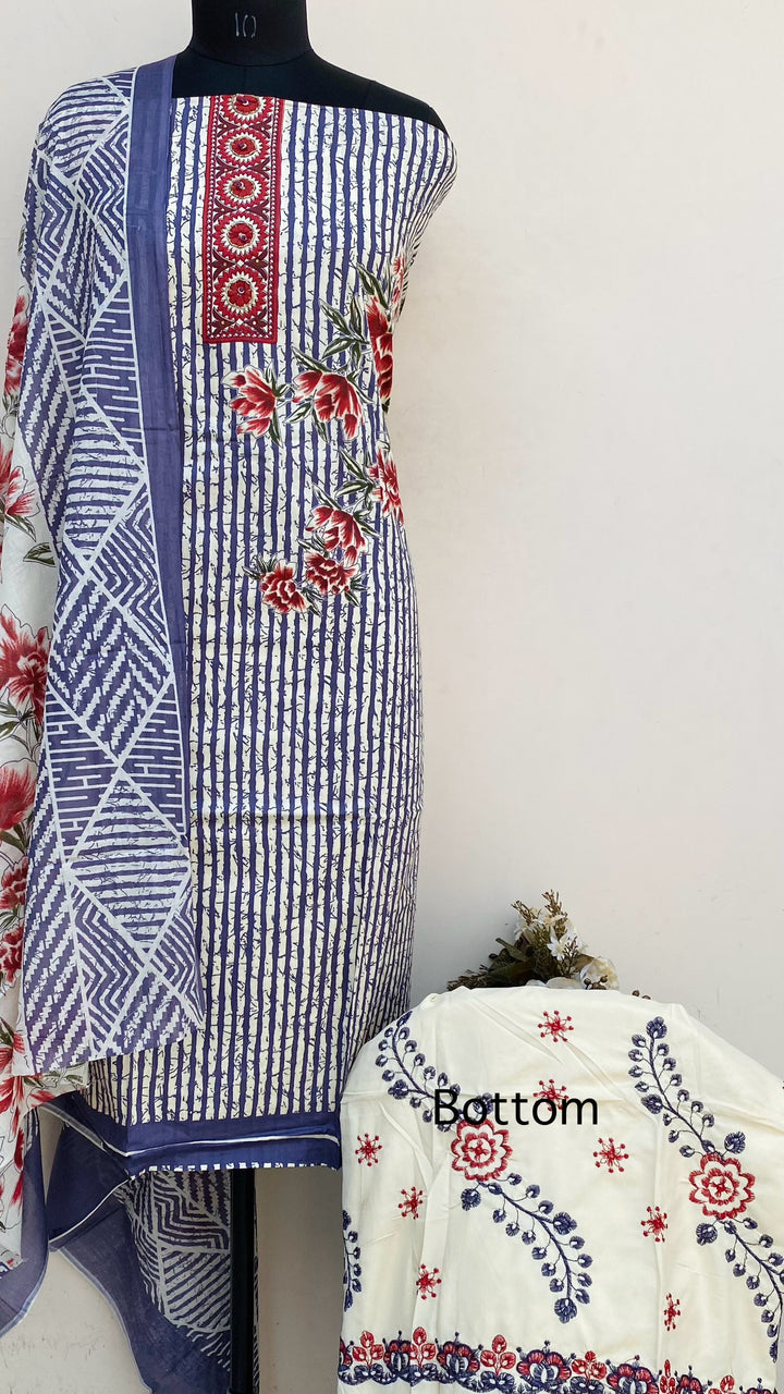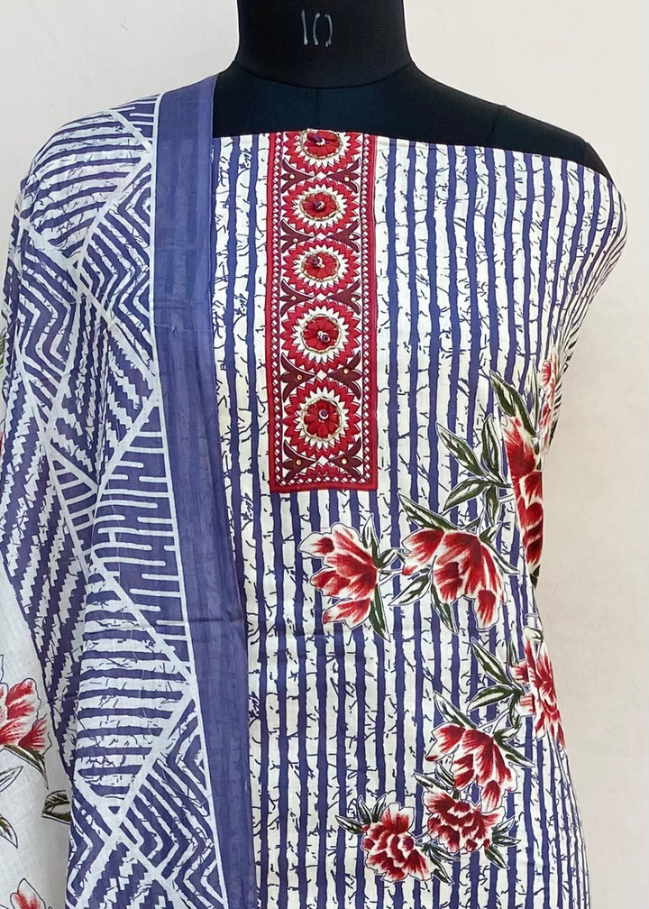 Designer Embroidered Suit Length 3 Piece Cream Mal Cotton With Sequence Work With Printed Mal Cotton Dupatta & Printed Same Colour Cotton Bottom
