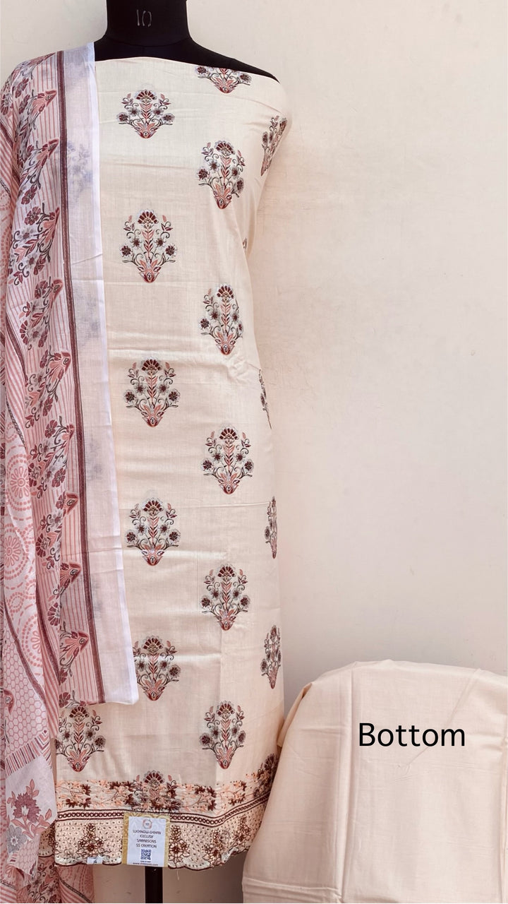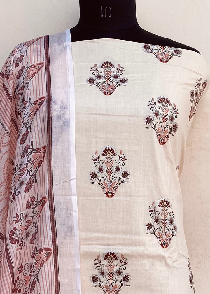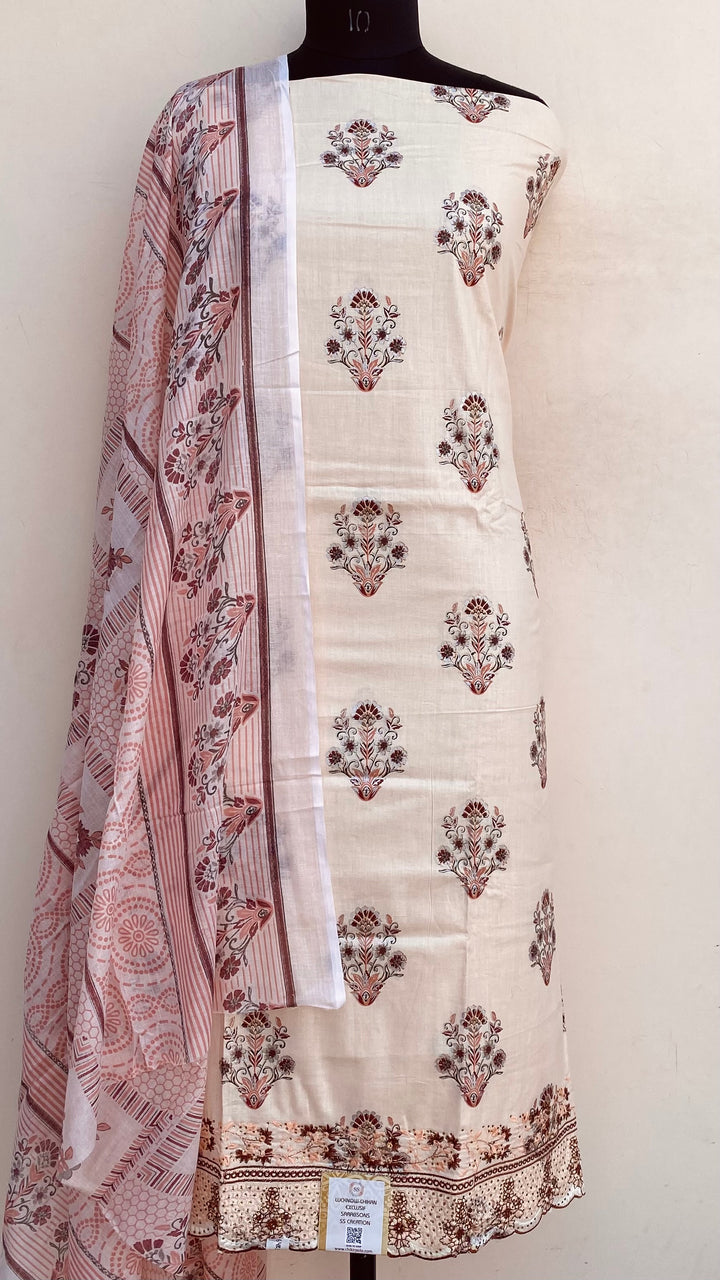 Designer Embroidered Suit Length 3 Piece Cream Mal Cotton With Stone Work With Printed Mal Cotton Dupatta & Same Colour Cotton Bottom