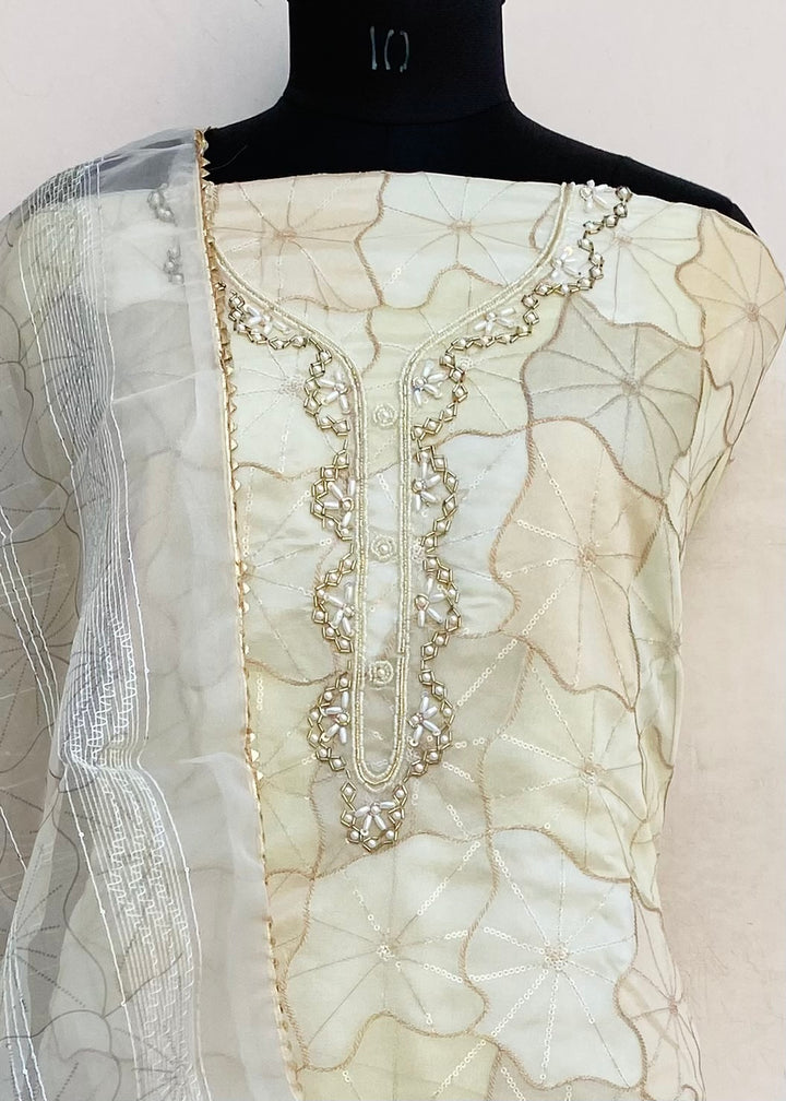 Designer Embroidered Suit Length 3 Piece Cream Organza With Pearl, Cutdana & Sequence Work