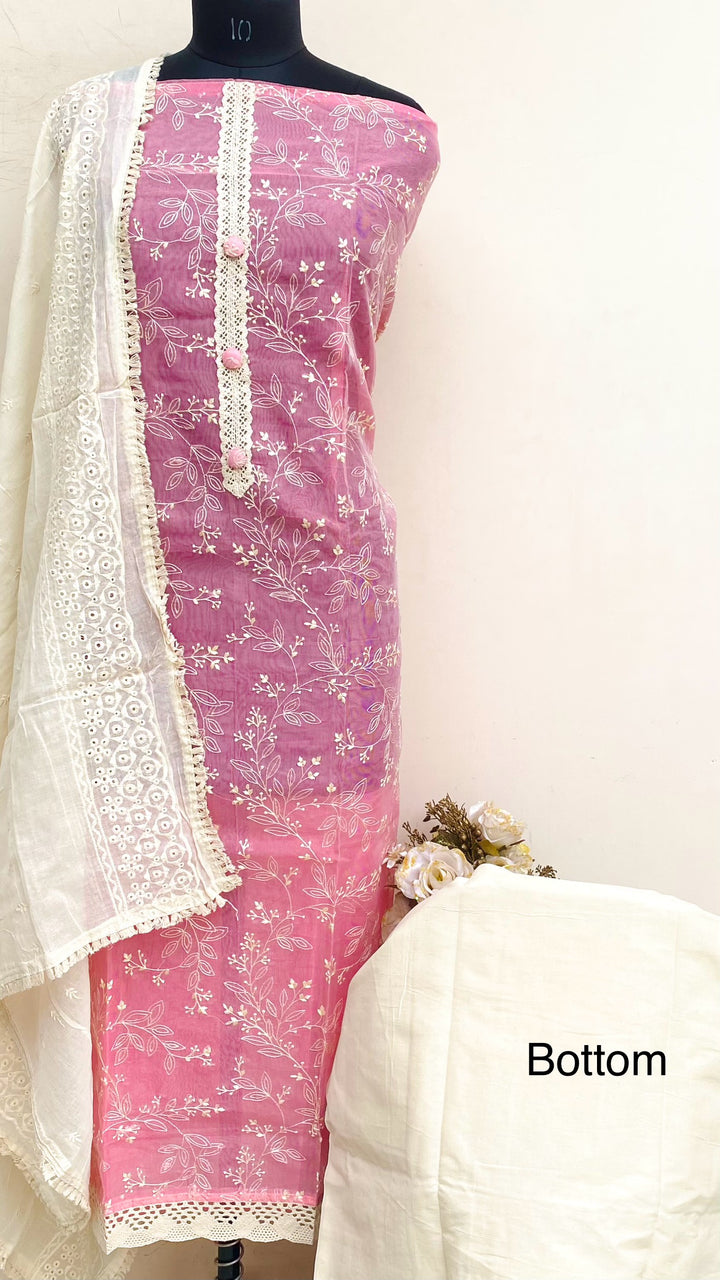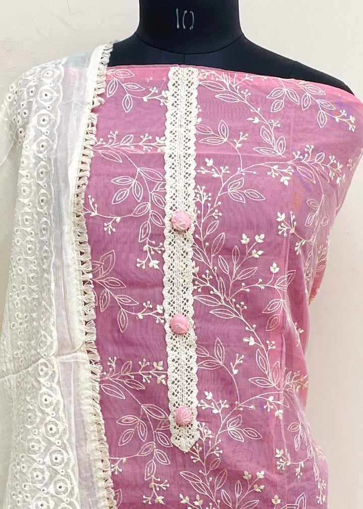Designer Embroidered Suit Length 3 Piece Pink Kota With Embroidered Mal Cotton Dupatta & Cream Colour Cotton Bottom