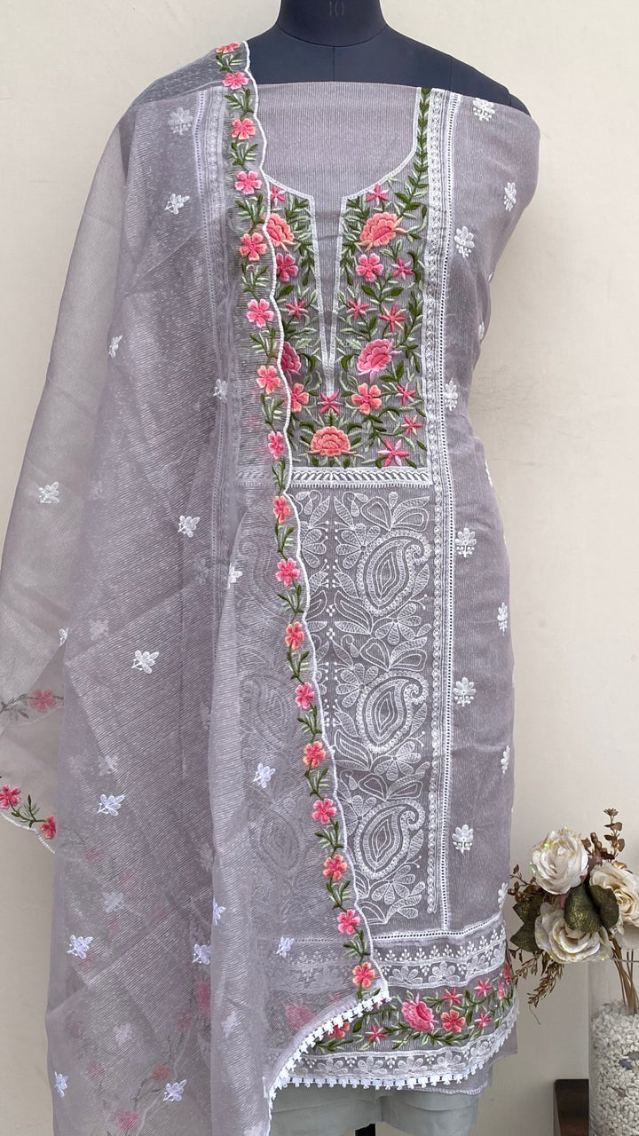 Designer Embroidered Suit Length 3 Piece Gray Kota With Embroidered Kota Dupatta & Same Colour Cotton Bottom
