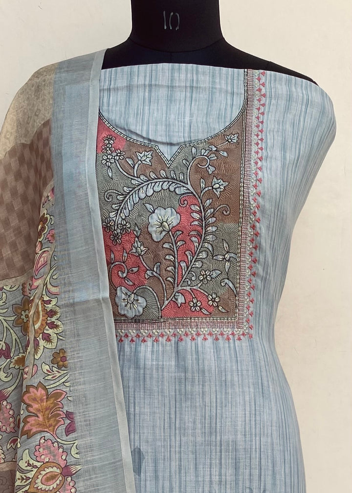 Designer Embroidered Suit Length 3 Piece Gray Linen With Sequence Work With Printed Linen Dupatta & Same Colour Cotton Bottom