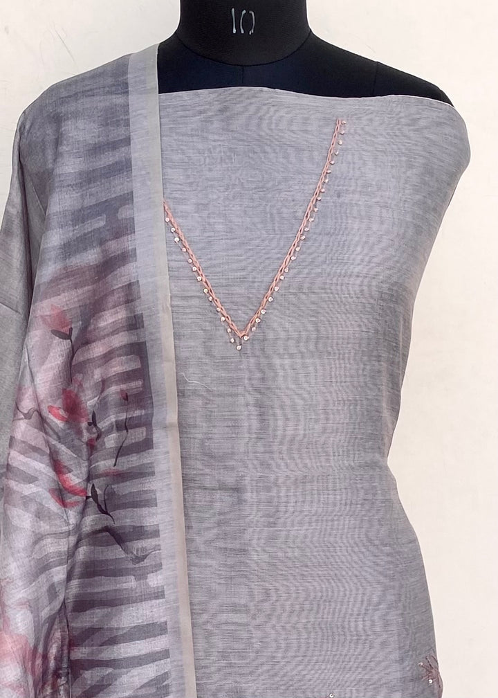 Designer Embroidered Suit Length 3 Piece Gray Linen With Sequence Work With Printed Linen Dupatta & Same Colour Cotton Bottom