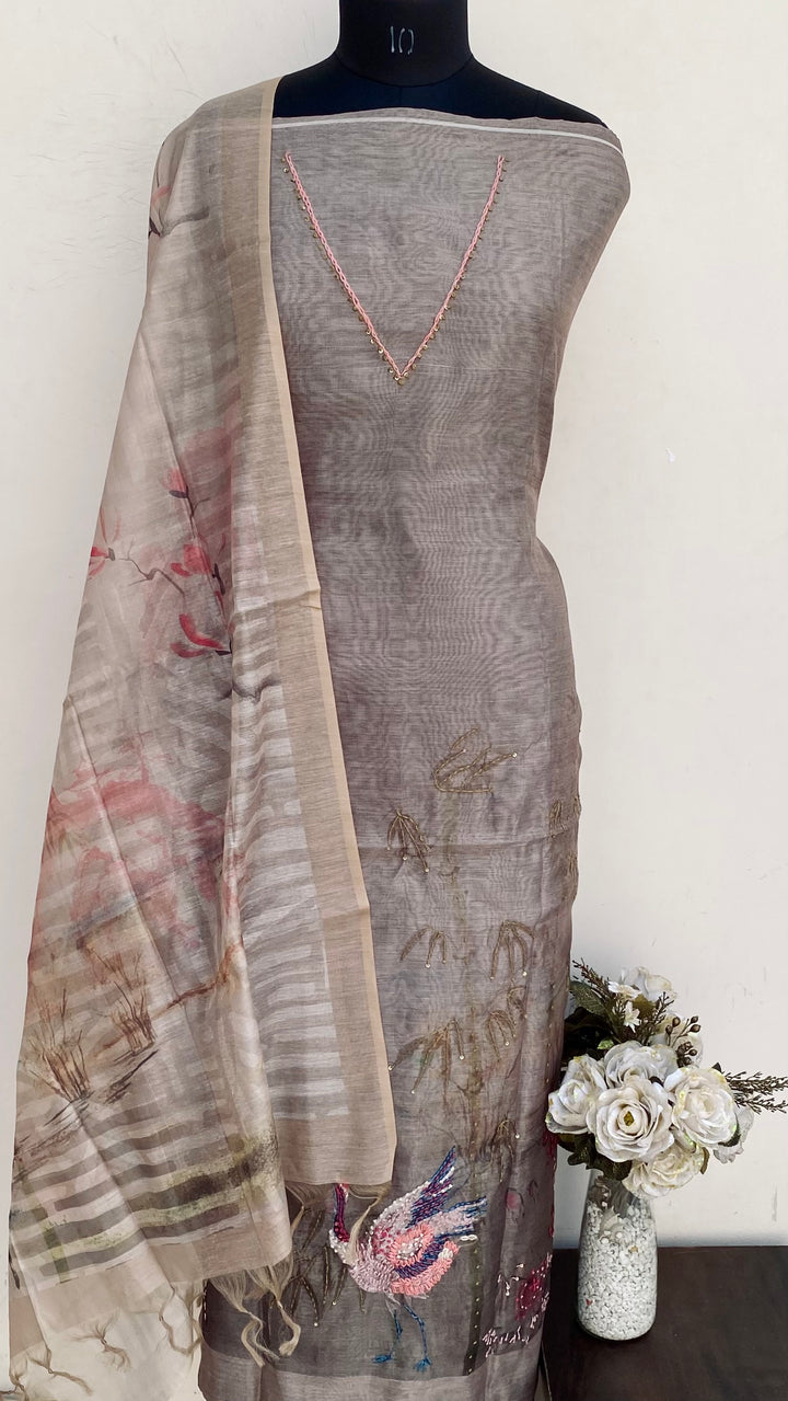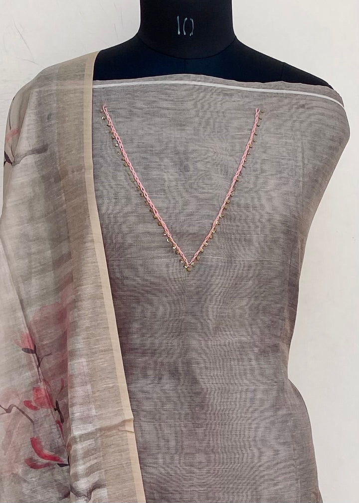 Designer Embroidered Suit Length 3 Piece Gray Linen With Sequence Work With Printed Linen Dupatta & Same Colour Cotton Bottom