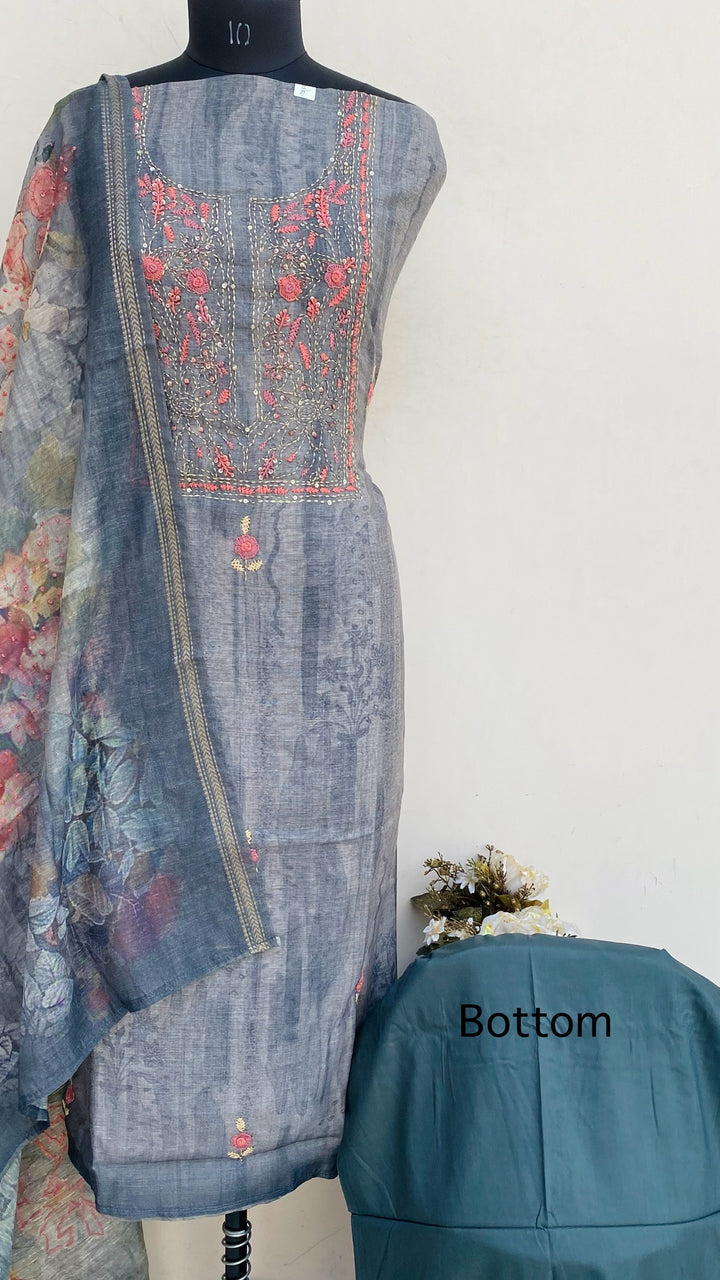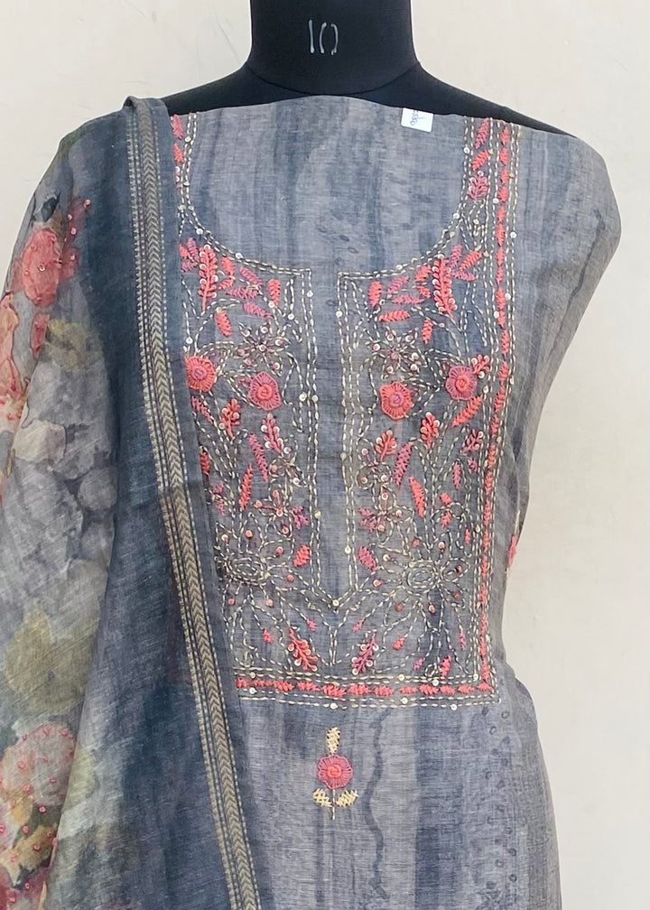 Designer Embroidered Suit Length 3 Piece Gray Linen With Sequence Work