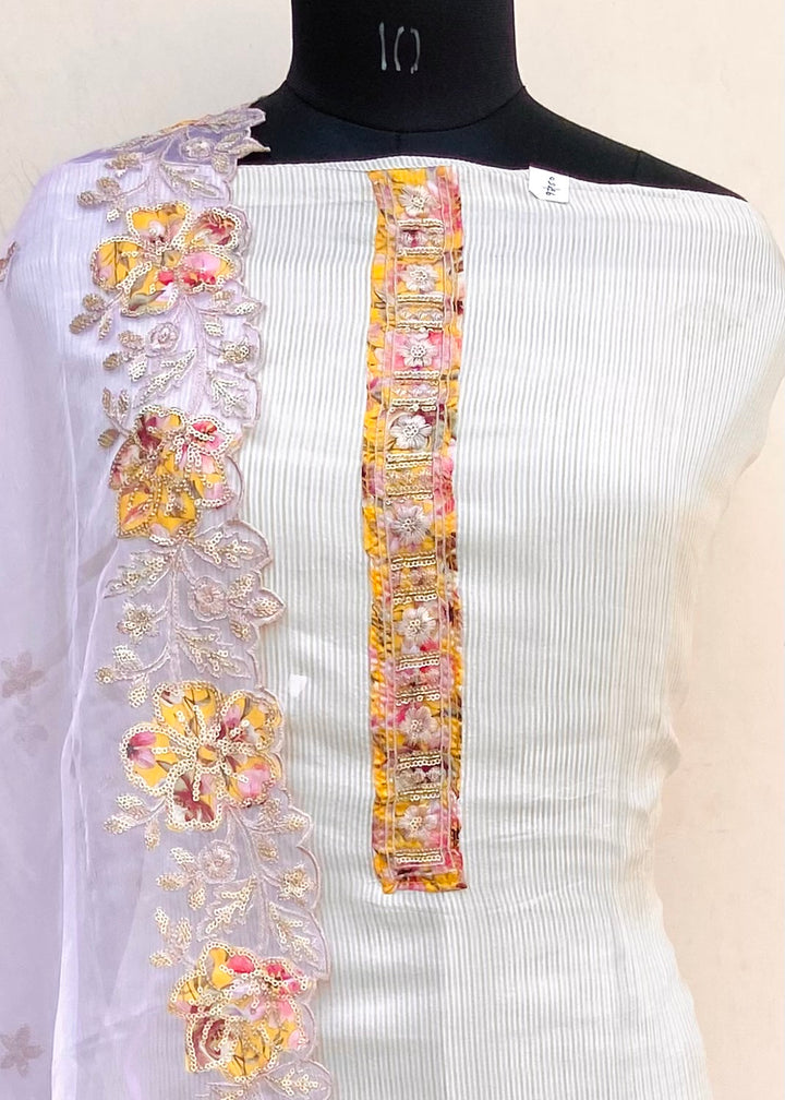 Designer Embroidered Suit Length 3 Piece Gray Mal Chanderi With Cutdana, Pearl & Sequence Work With Embroidered Organza Dupatta & Same Colour Cotton Bottom