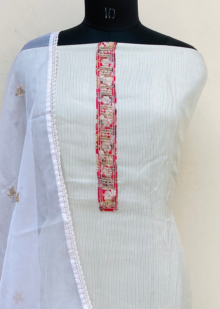 Designer Embroidered Suit Length 3 Piece Gray Mal Chanderi With Pearl ,Cutdana & Sequence Work With Embroidered Organza Dupatta & Same Colour Cotton Bottom
