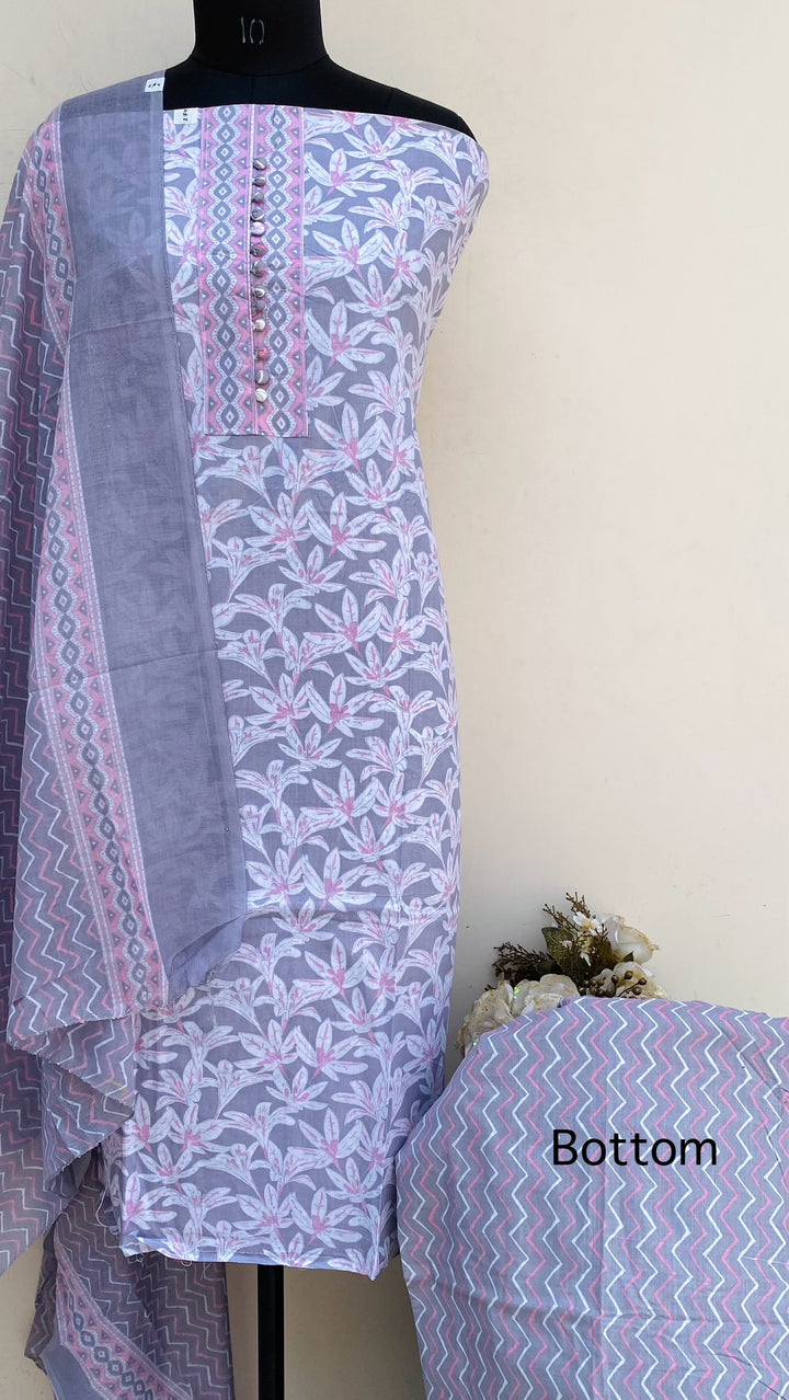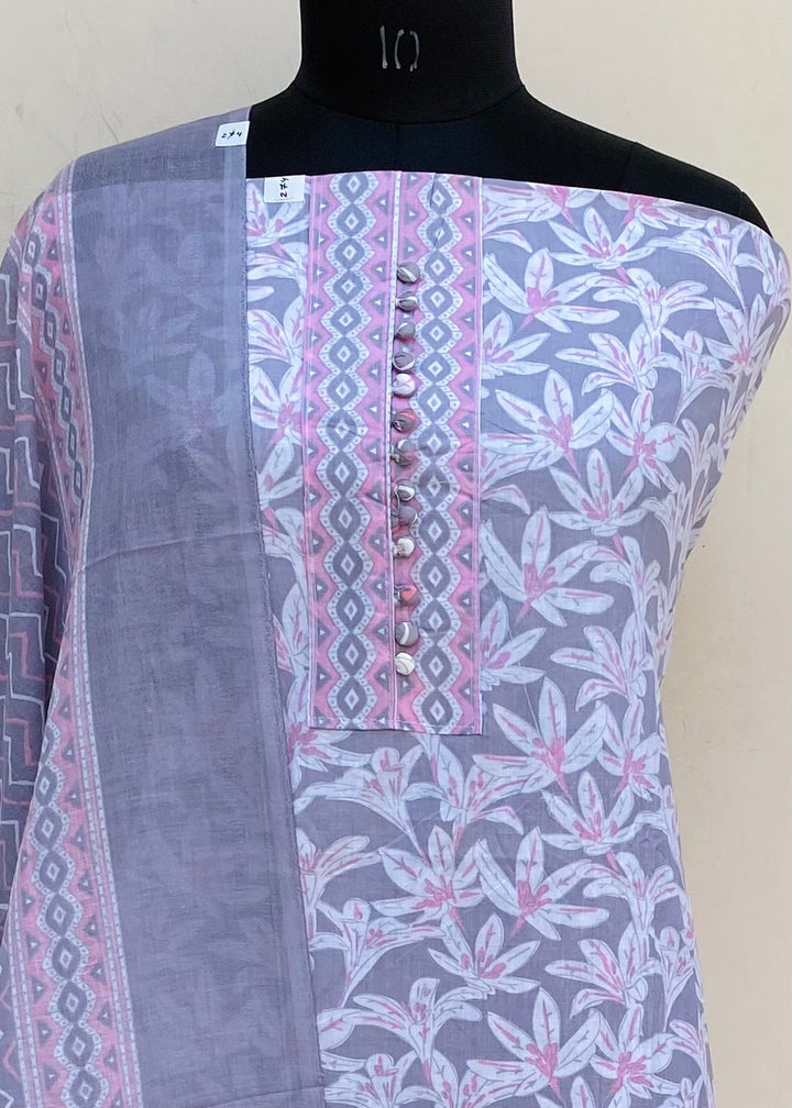 Designer Embroidered Suit Length 3 Piece Gray Mal Cotton With Printed Mal Cotton Dupatta & Printed Same Colour Cotton Bottom