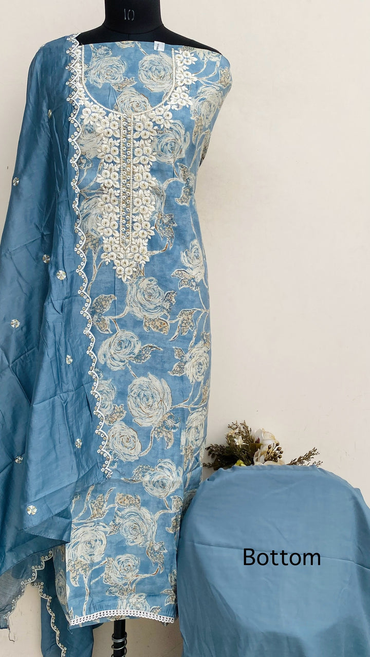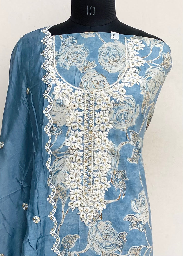 Designer Embroidered Suit Length 3 Piece Gray Muslin Cotton With Sequence Work With Embroidered Muslin Dupatta & Same Colour Santoon Bottom