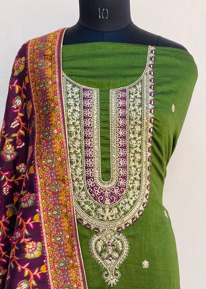 Designer Embroidered Suit Length 3 Piece Green Georgette With Sequence Work With Embroidered Mal Chanderi Dupatta & Same Colour Santoon Bottom