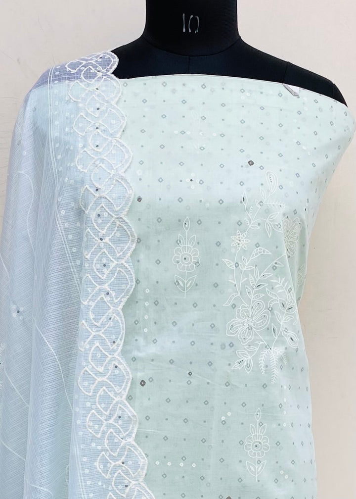 Designer Embroidered Suit Length 3 Piece Green Linen With Embroidered Kota Dupatta & Same Colour Cotton Bottom
