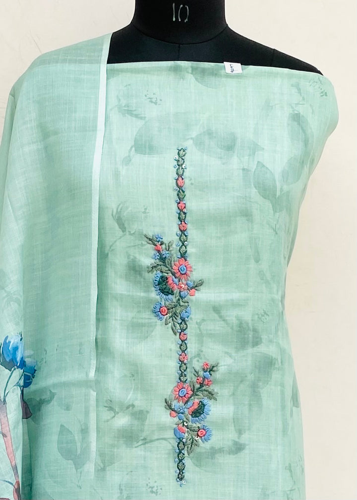 Designer Embroidered Suit Length 3 Piece Green Linen With Sequence Work With Printed Linen Dupatta & Same Colour Cotton Bottom