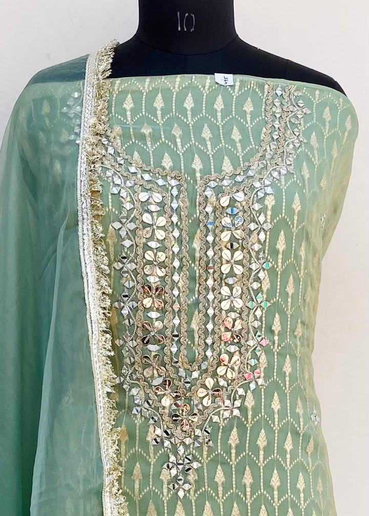 Designer Embroidered Suit Length 3 Piece Green Mal Chanderi With Mirror Work With Embroidered Organza Dupatta & Same Colour Cotton Bottom
