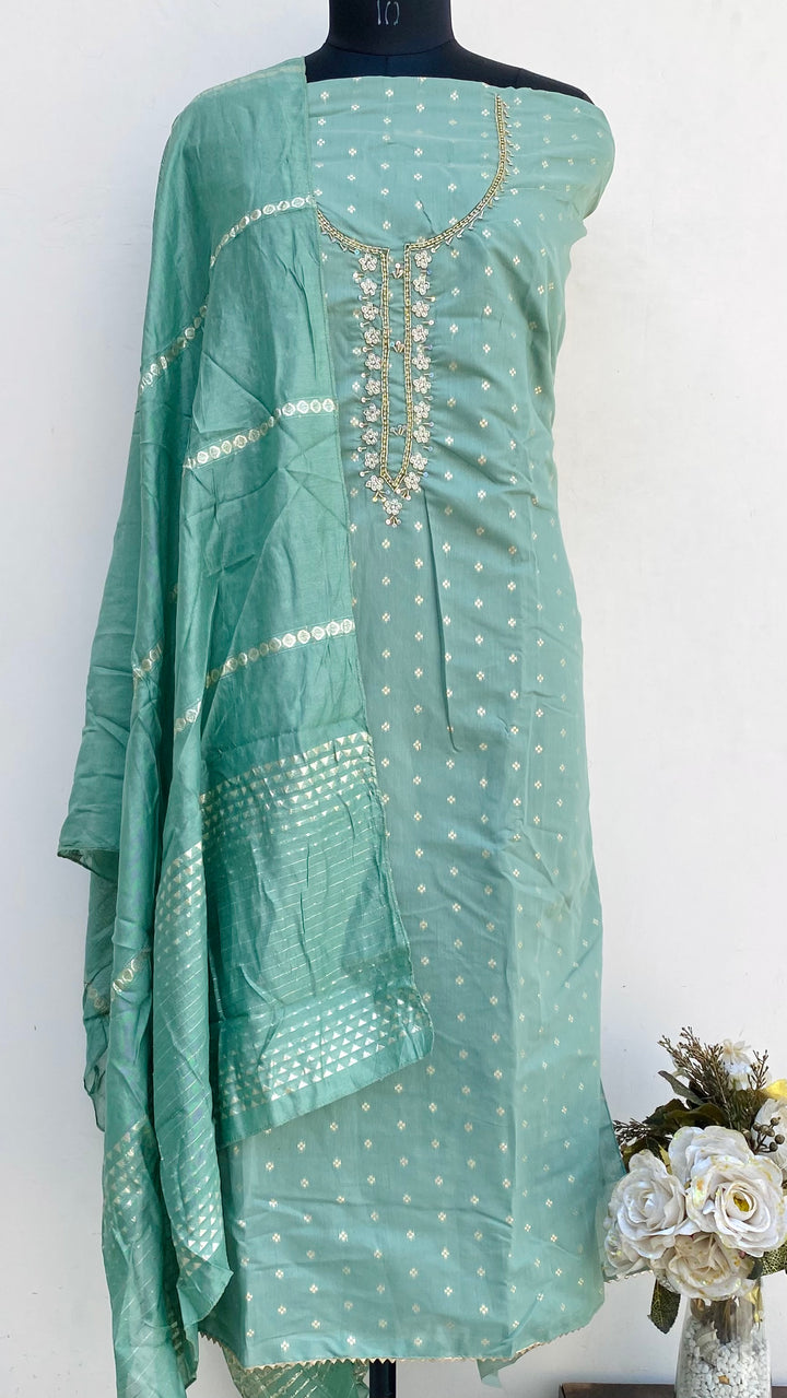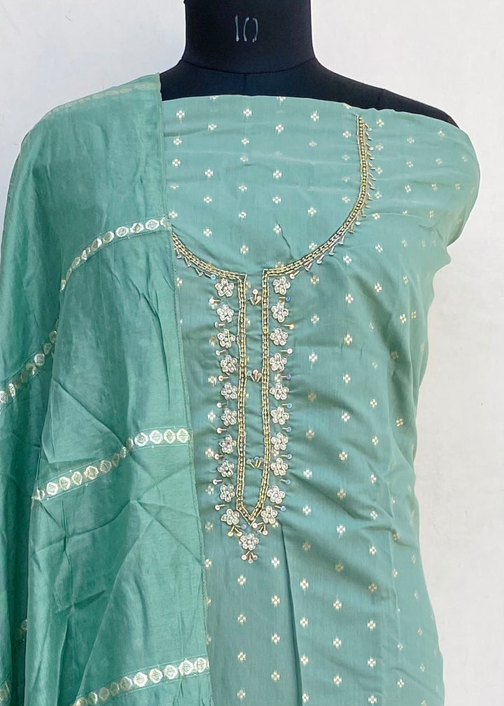 Designer Embroidered Suit Length 3 Piece Green Mal Chanderi With Pearl, Sequence & Cutdana Work