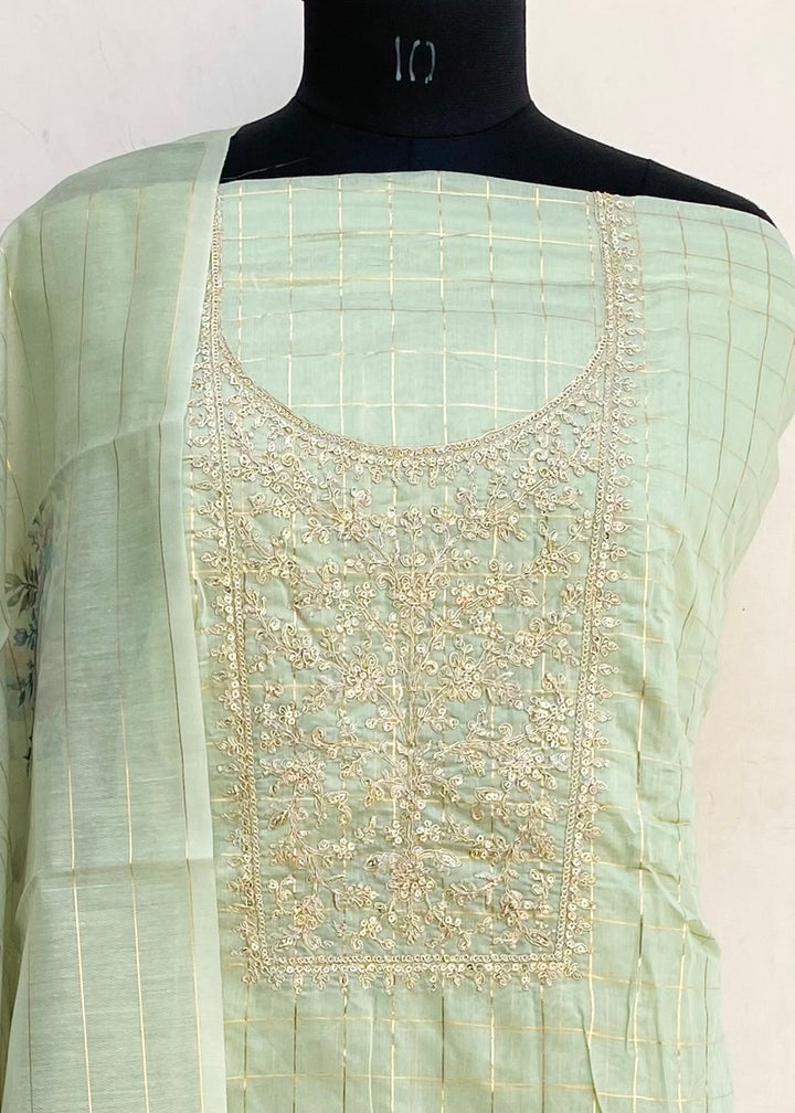 Designer Embroidered Suit Length 3 Piece Green Mal Chanderi With Sequence Work