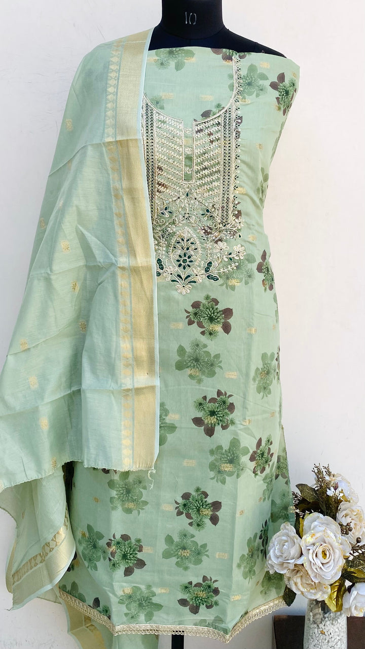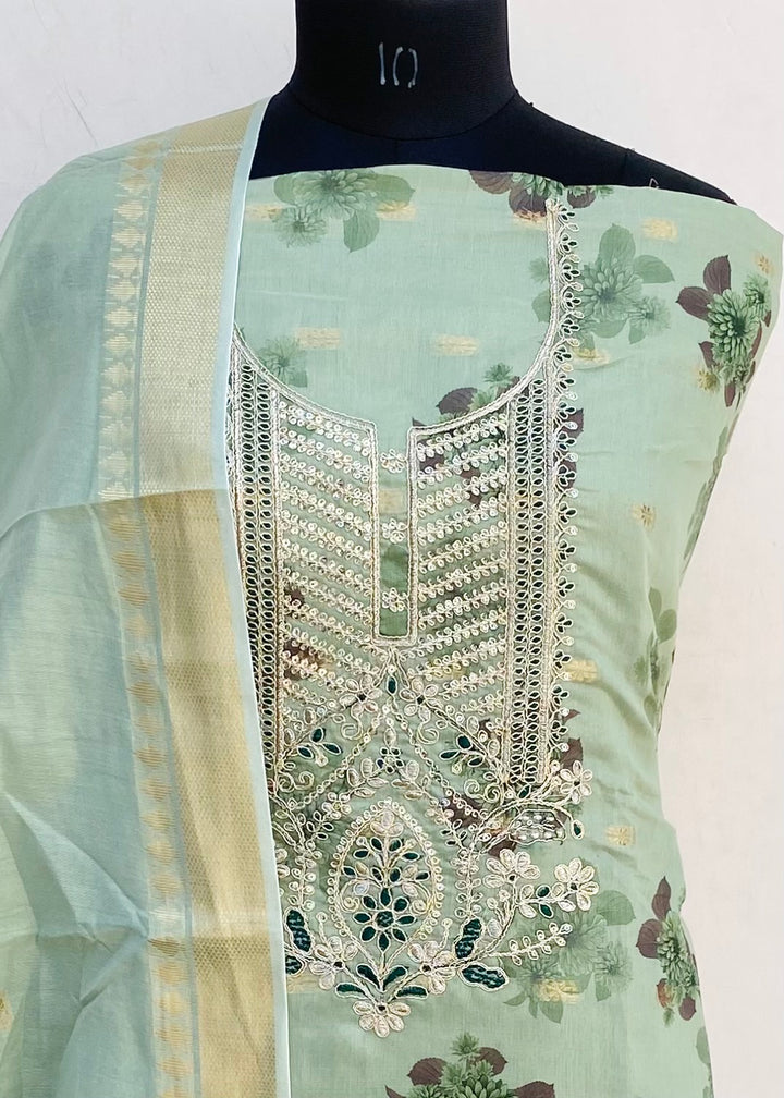 Designer Embroidered Suit Length 3 Piece Green Mal Chanderi With Sequence Work