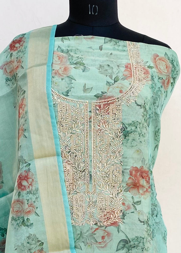Designer Embroidered Suit Length 3 Piece Green Mal Chanderi With Stone Work