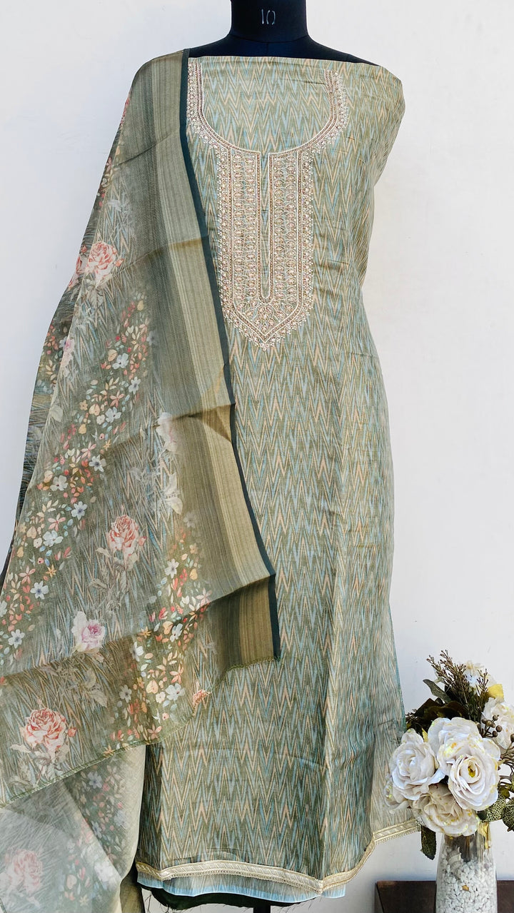 Designer Embroidered Suit Length 3 Piece Green Mal Chanderi With Stone Work With Printed Mal Chanderi Dupatta & Same Colour Santoon Bottom