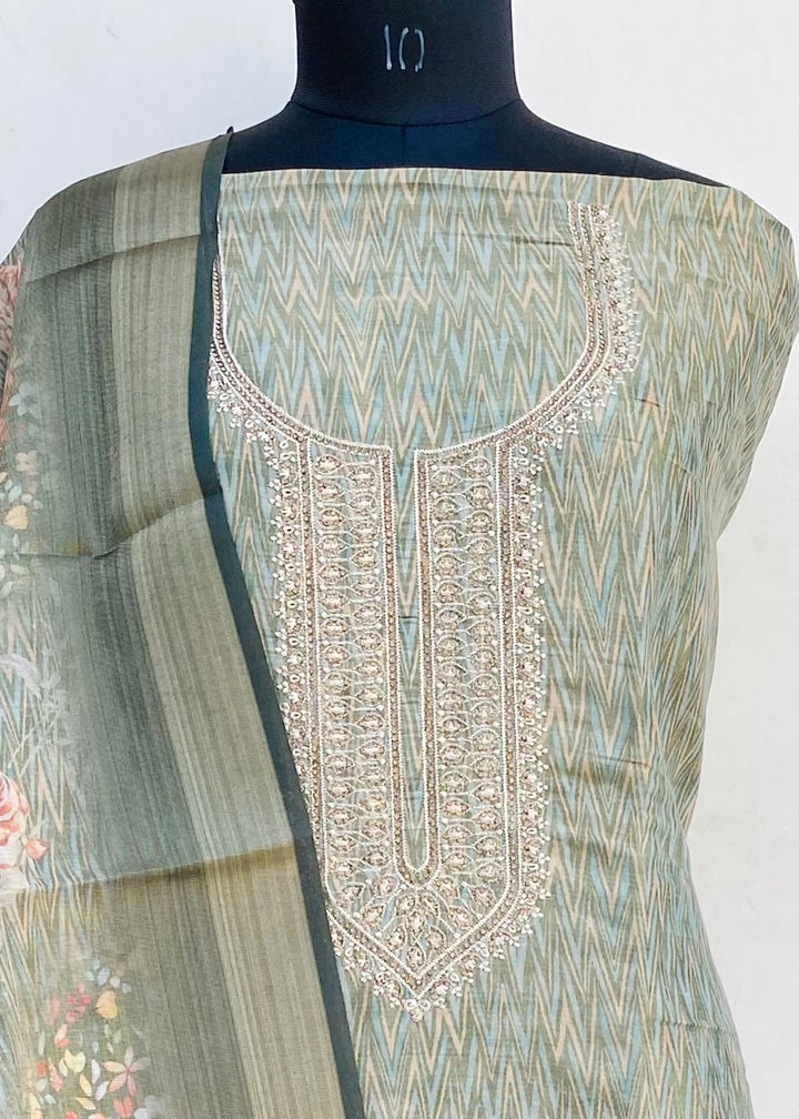 Designer Embroidered Suit Length 3 Piece Green Mal Chanderi With Stone Work