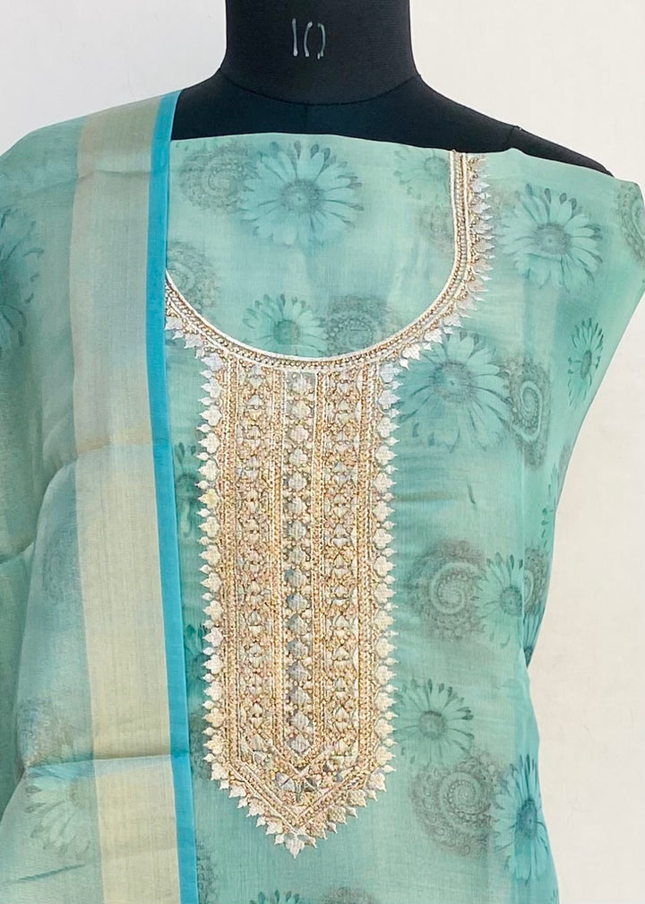 Designer Embroidered Suit Length 3 Piece Green Mal Chanderi With Stone Work With Printed Mal Chanderi Dupatta & Same Colour Santoon Bottom