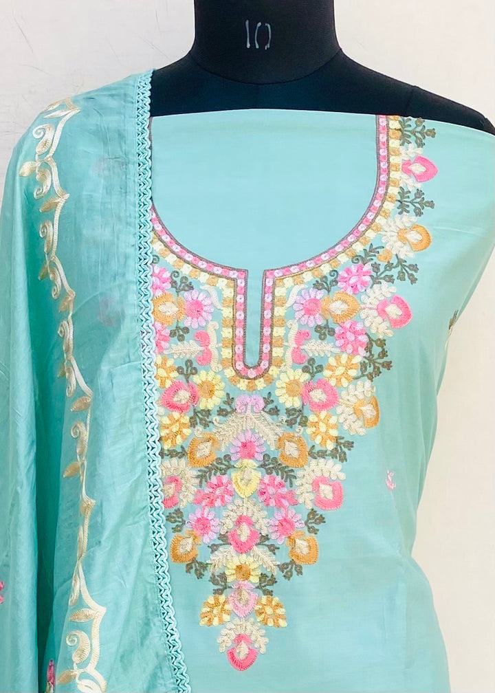 Designer Embroidered Suit Length 3 Piece Green Mal Cotton With Embroidered Mal Chanderi Dupatta & Same Colour Santoon Bottom