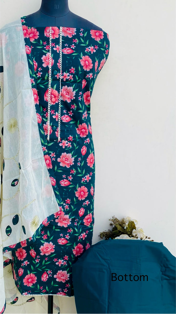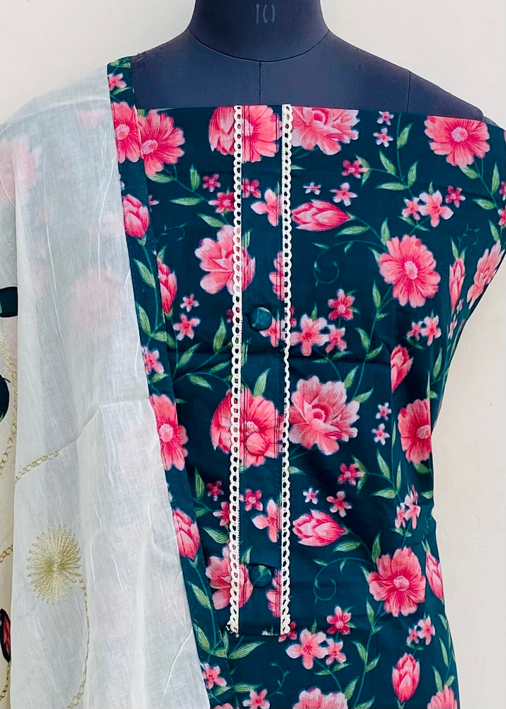 Designer Embroidered Suit Length 3 Piece Green Mal Cotton With Embroidered Mal Cotton Dupatta & Same Colour Cotton Bottom