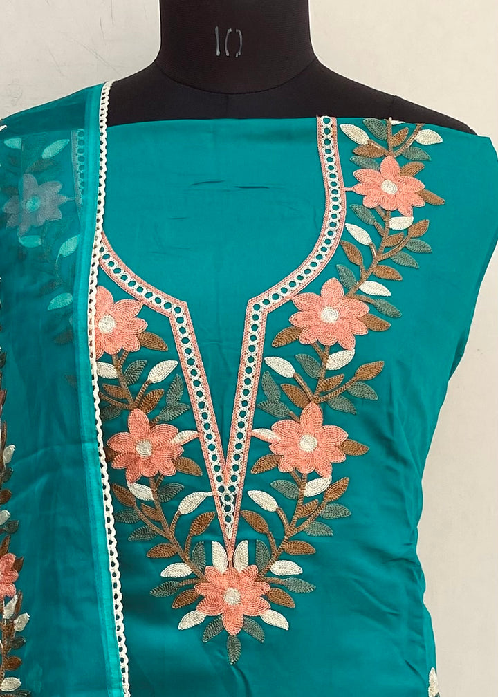Designer Embroidered Suit Length 3 Piece Green Mal Cotton With Embroidered Organza Dupatta & Same Colour Santoon Bottom