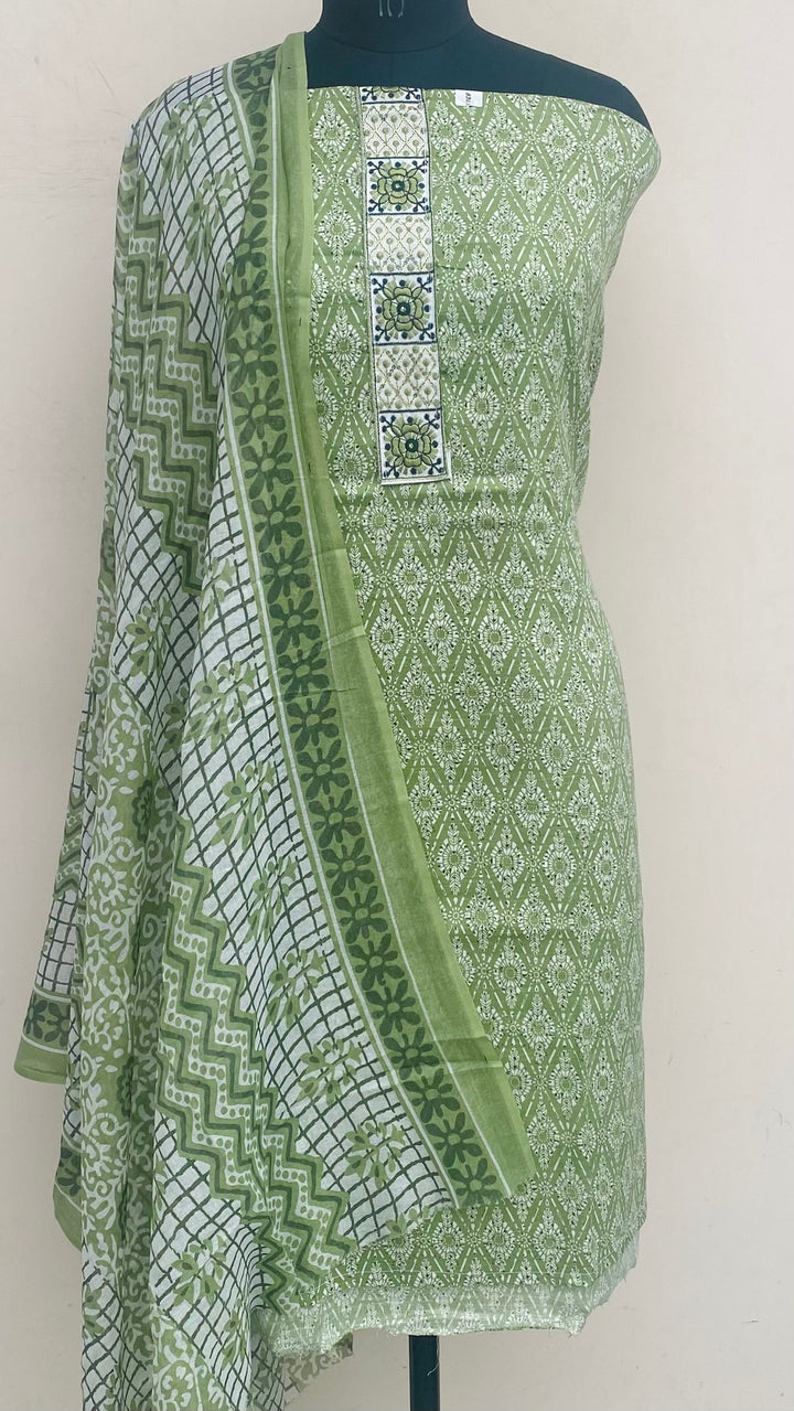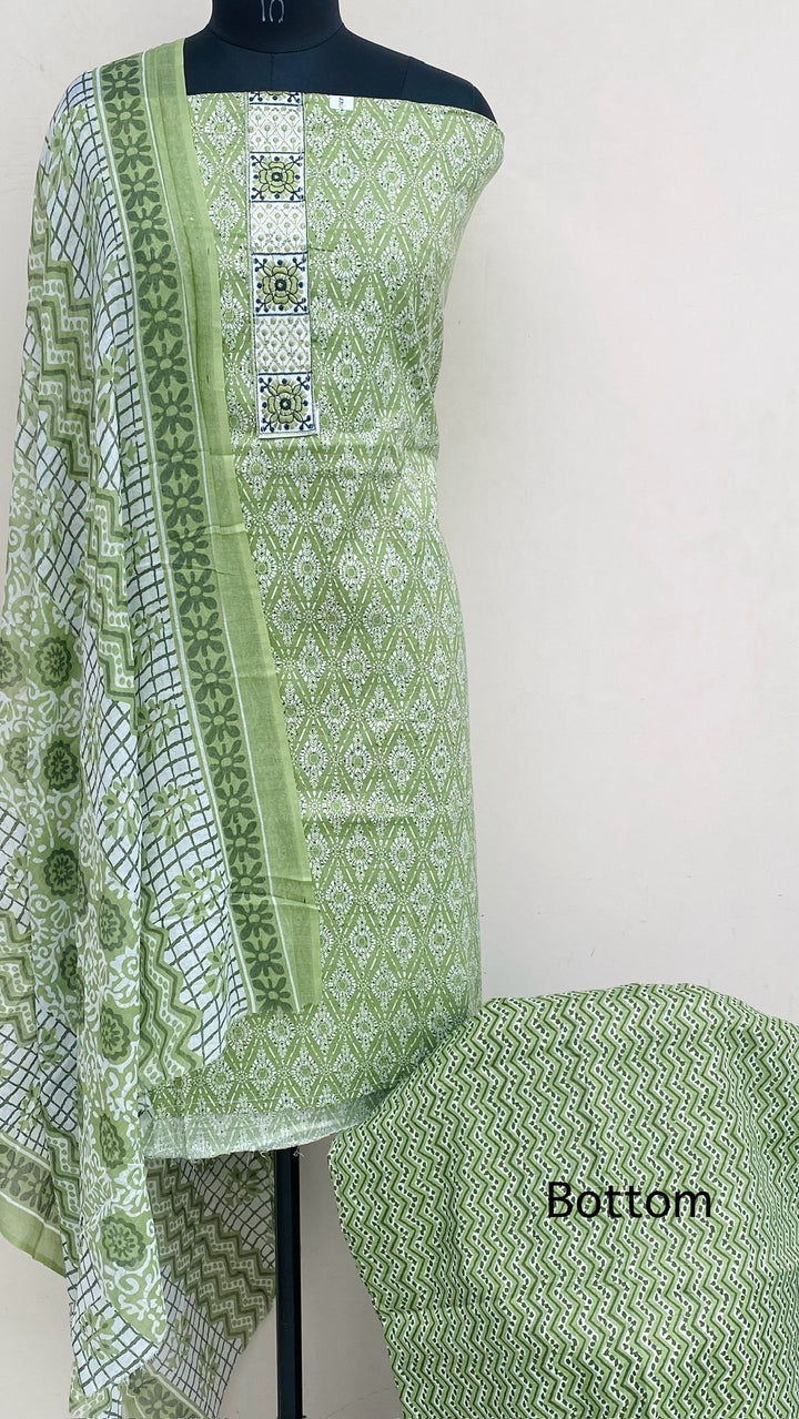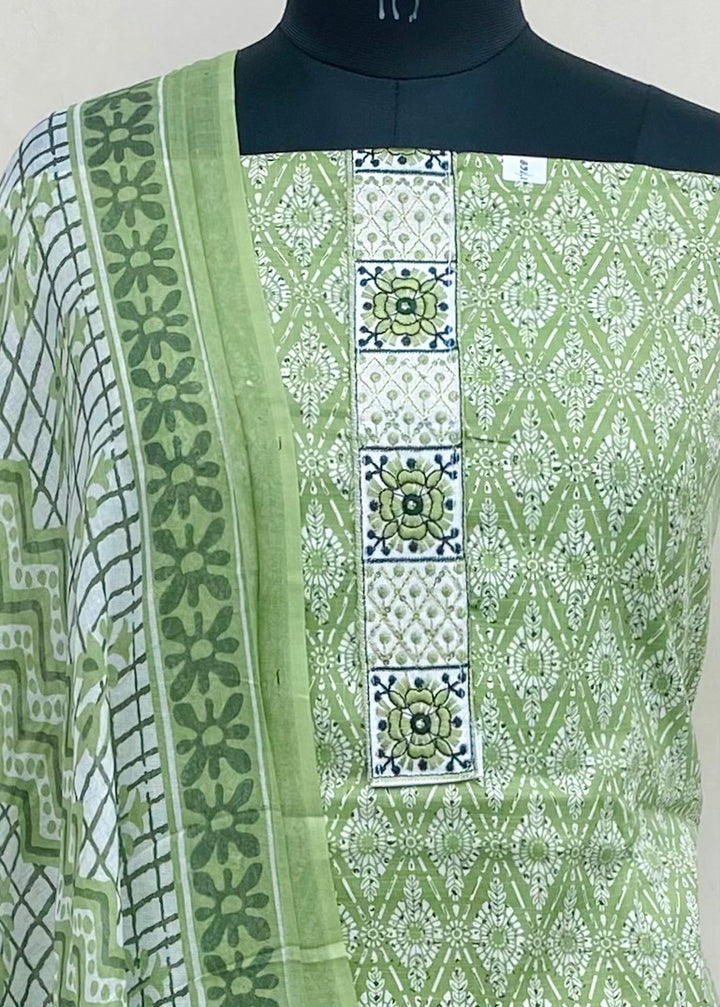 Designer Embroidered Suit Length 3 Piece Green Mal Cotton With Sequence Work With Printed Mal Cotton Dupatta & Printed Same Colour Cotton Bottom