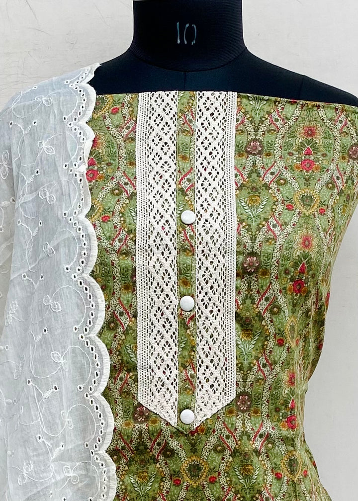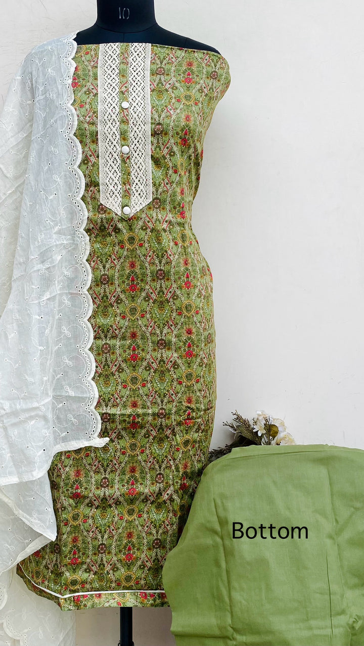 Designer Embroidered Suit Length 3 Piece Green Muslin Cotton With Embroidered Mal Cotton Dupatta & Same Colour Cotton Bottom