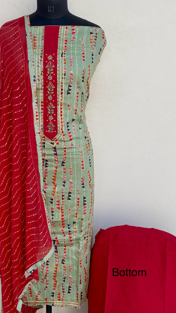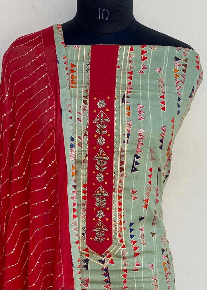 Designer Embroidered Suit Length 3 Piece Green Muslin Cotton With Cutdana Work With Embroidered Pure Chiffon Dupatta & Red Colour Cotton Bottom