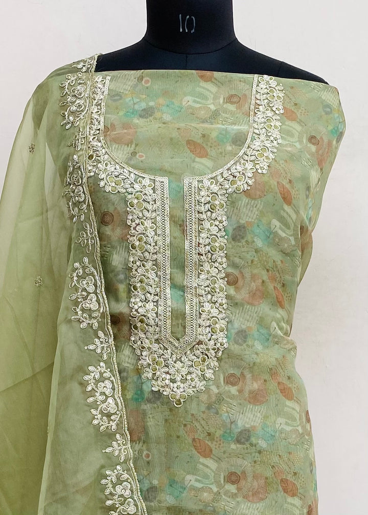 Designer Embroidered Suit Length 3 Piece Green Organza With Sequence Work