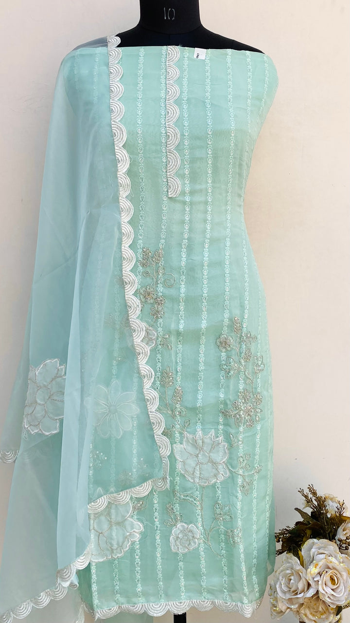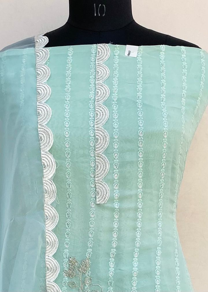 Designer Embroidered Suit Length 3 Piece Green Organza With Sequence Work With Embroidered Organza Dupatta & Same Colour Cotton Bottom