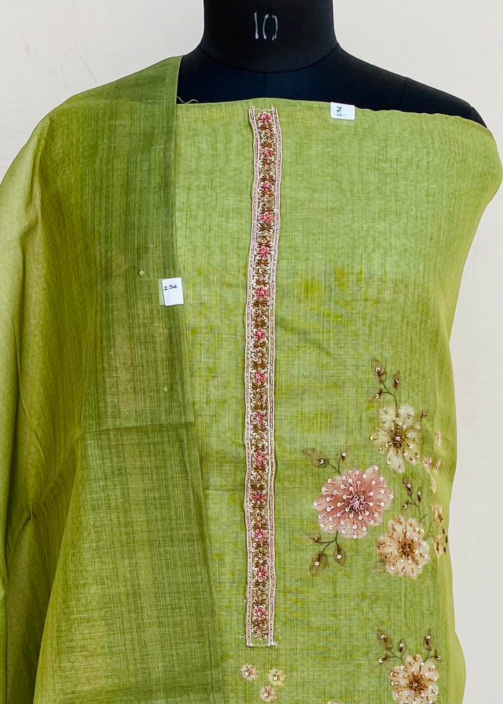 Designer Embroidered Suit Length 3 Piece Green Tissue With Sequence, Pearl & Cutdana Work With Printed Tissue Dupatta & Same Colour Cotton Bottom