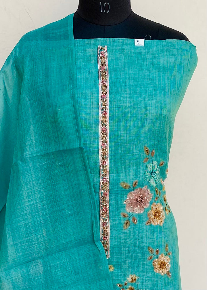 Designer Embroidered Suit Length 3 Piece Green Tissue With Sequence, Pearl & Cutdana Work With Printed Tissue Dupatta & Same Colour Cotton Bottom