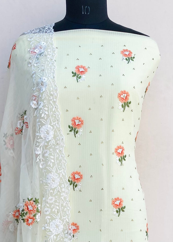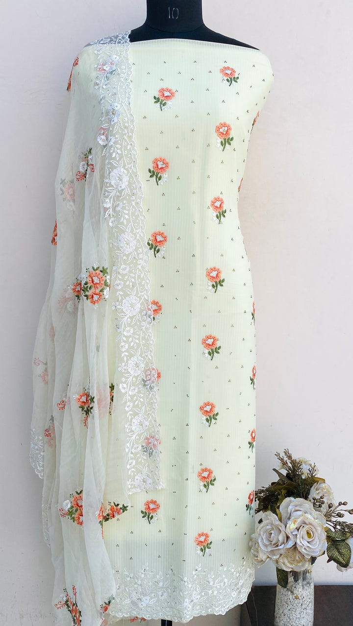 Designer Embroidered Suit Length 3 Piece Lemon Yellow Georgette With Stone & Sequence Work With Embroidered Pure Chiffon Dupatta & Same Colour Santoon Bottom