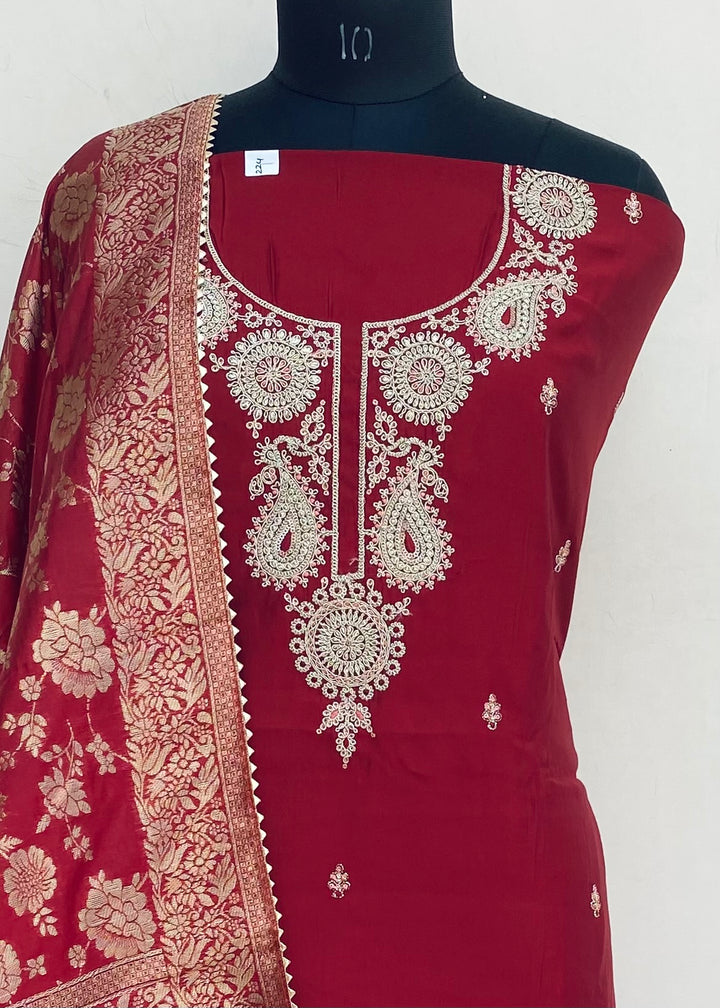 Designer Embroidered Suit Length 3 Piece Maroon Mal Chanderi With Embroidered Mal Chanderi Dupatta & Same Colour Santoon Bottom