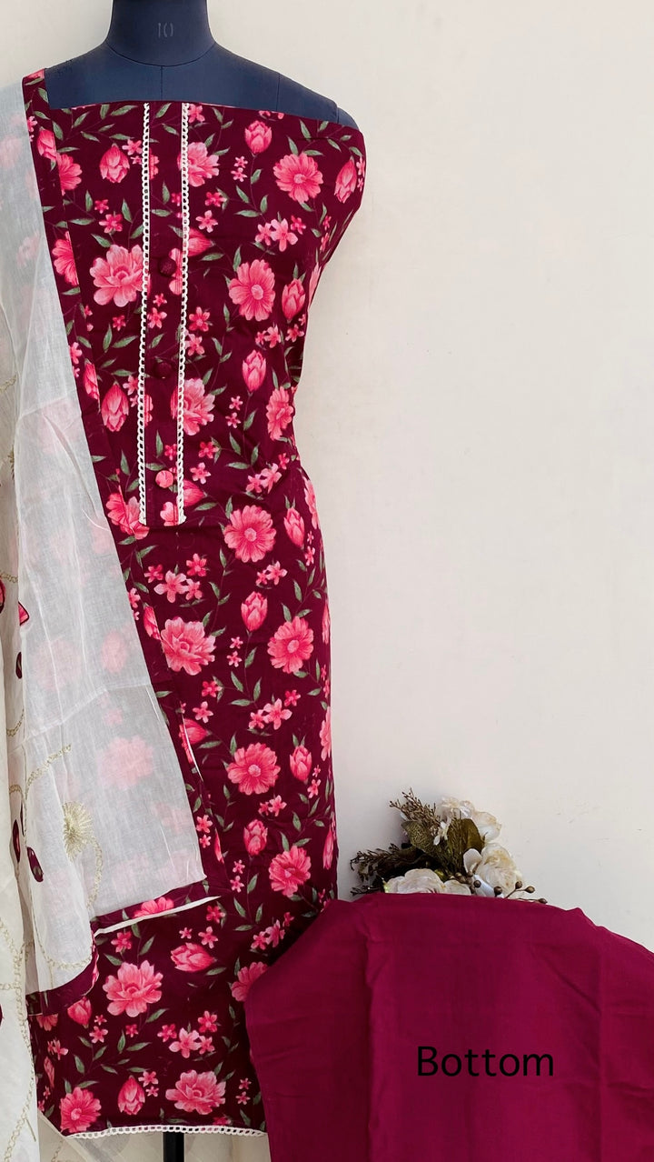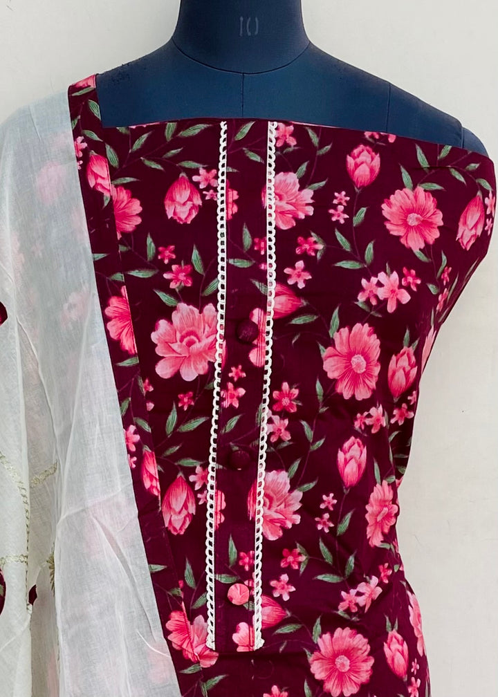 Designer Embroidered Suit Length 3 Piece Maroon Mal Cotton With Embroidered Mal Cotton Dupatta & Same Colour Cotton Bottom