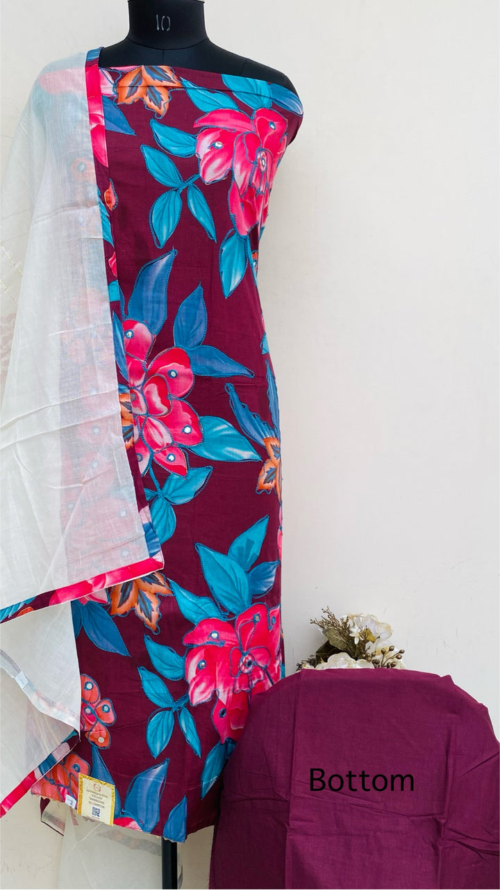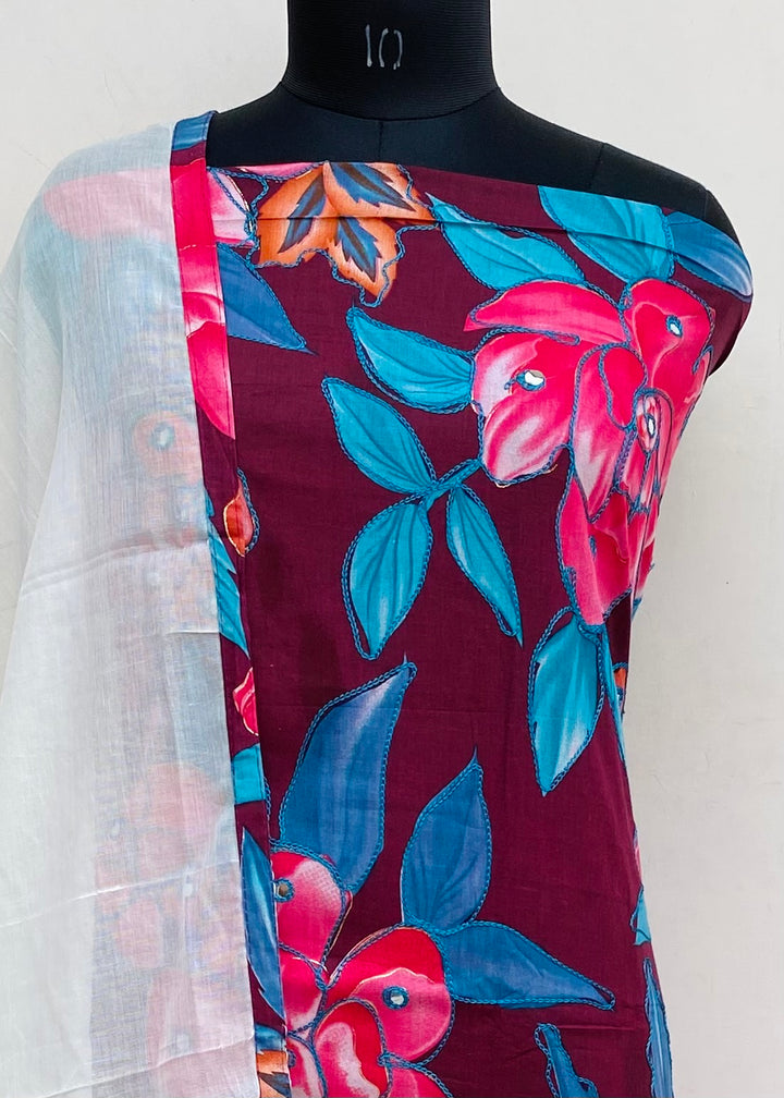 Designer Embroidered Suit Length 3 Piece Maroon Mal Cotton With Embroidered Mal Cotton Dupatta & Same Colour Cotton Bottom