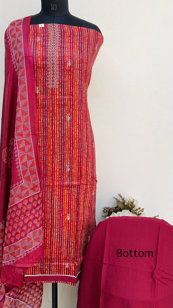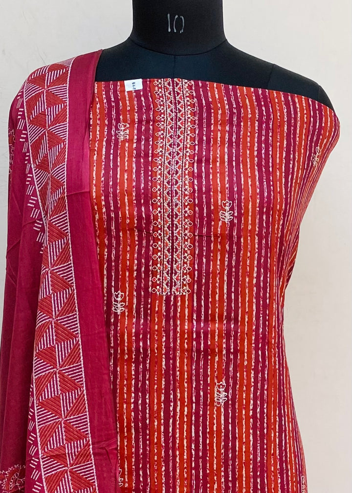Designer Embroidered Suit Length 3 Piece Maroon Mal Cotton With Printed Mal Cotton Dupatta & Same Colour Cotton Bottom