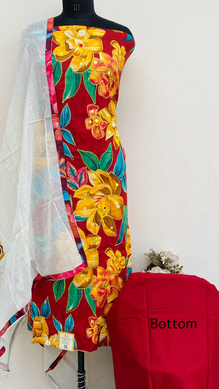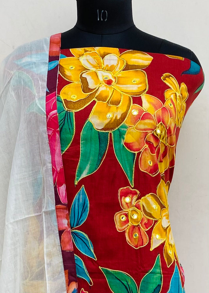 Designer Embroidered Suit Length 3 Piece Maroon Mal Cotton With Embroidered Mal Cotton Dupatta & Same Colour Cotton Bottom