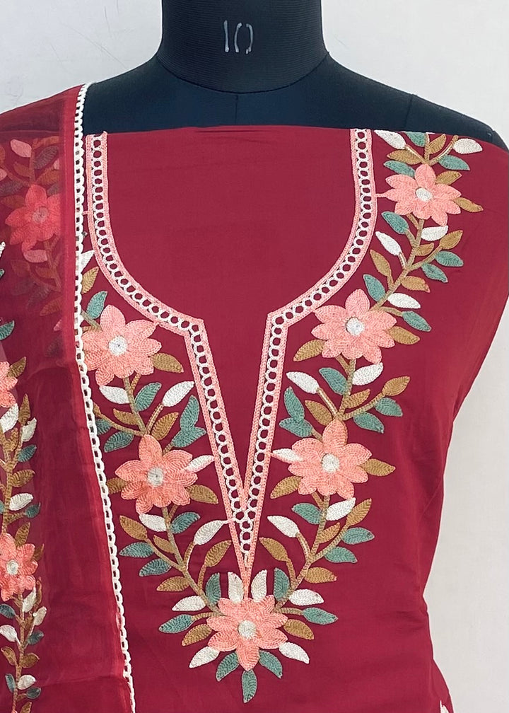 Designer Embroidered Suit Length 3 Piece Maroon Mal Cotton With Embroidered Organza Dupatta & Same Colour Santoon Bottom