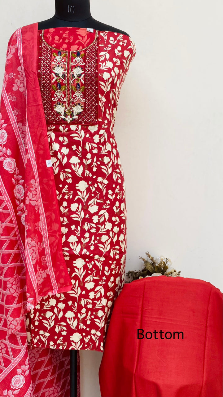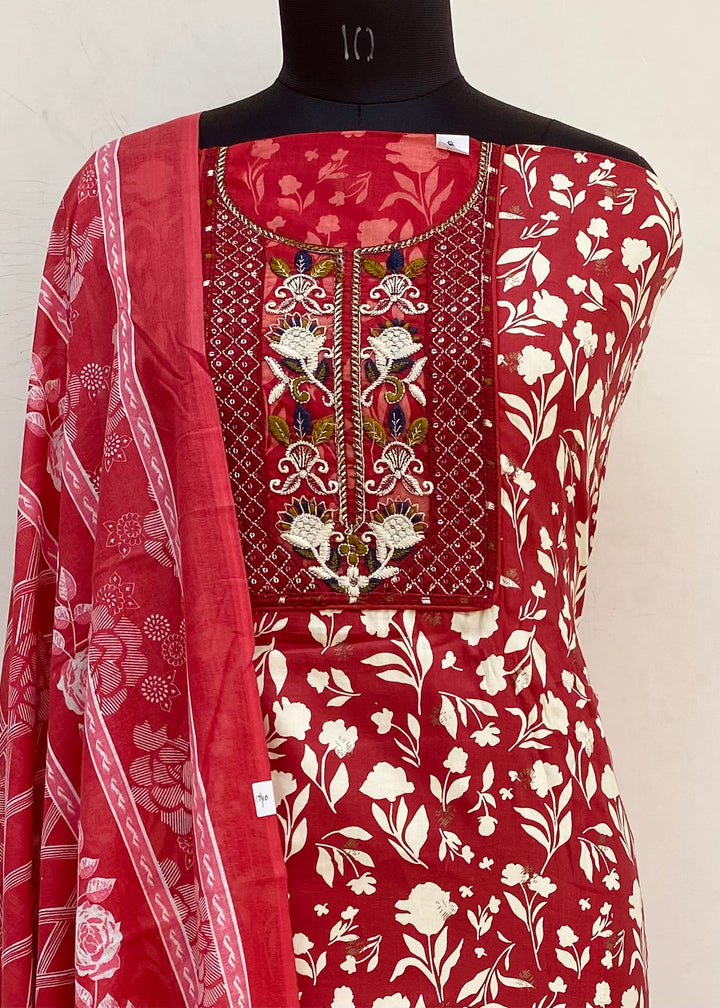 Designer Embroidered Suit Length 3 Piece Maroon Mal Cotton With Sequence Work With Printed Mal Cotton Dupatta & Same Colour Cotton Bottom