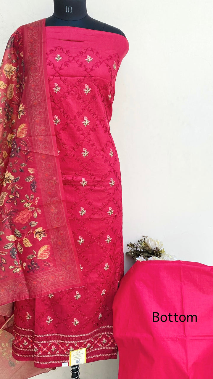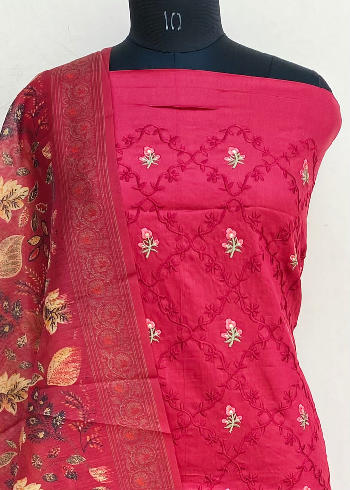 Designer Embroidered Suit Length 3 Piece Maroon Muslin Cotton With Printed Mal Chanderi Dupatta & Same Colour Cotton Bottom