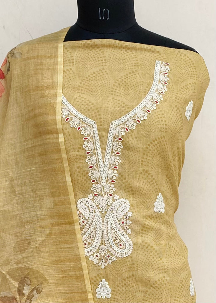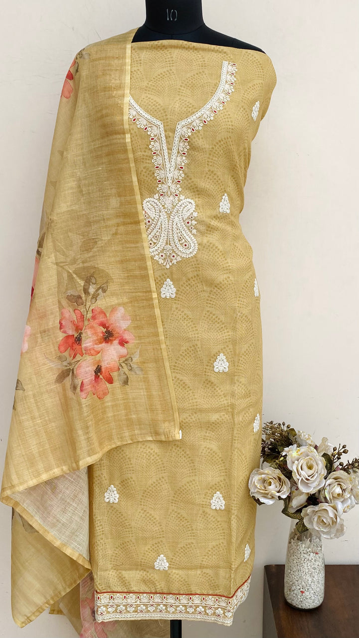 Designer Embroidered Suit Length 3 Piece Mehndi Green Linen With Sequence Work With Printed Linen Dupatta & Same Colour Cotton Bottom