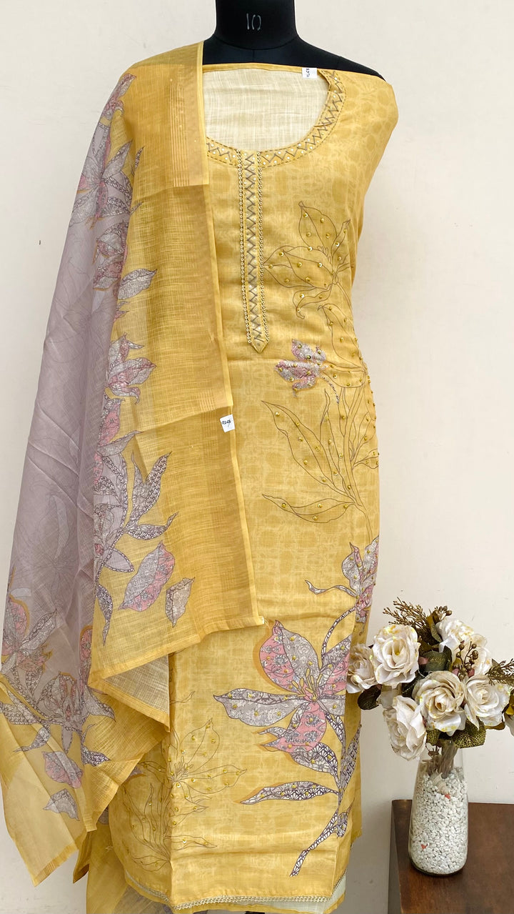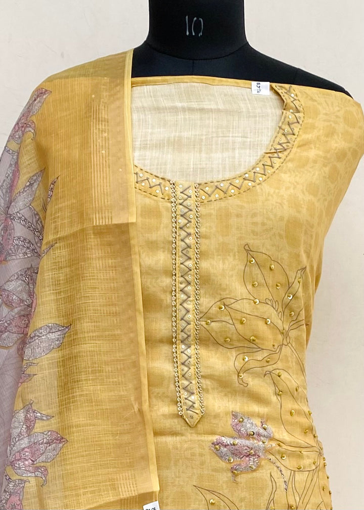 Designer Embroidered Suit Length 3 Piece Mehndi Green Linen With Sequence Work With Printed Linen Dupatta & Same Colour Cotton Bottom