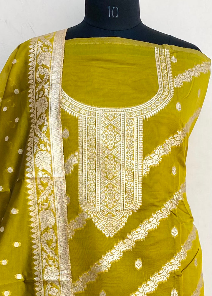 Designer Embroidered Suit Length 3 Piece Mehndi Green Mal Chanderi With Embroidered Mal Chanderi Dupatta & Same Colour Santoon Bottom