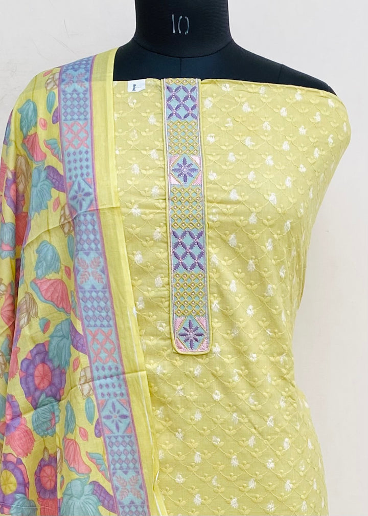 Designer Embroidered Suit Length 3 Piece Mehndi Green Mal Cotton