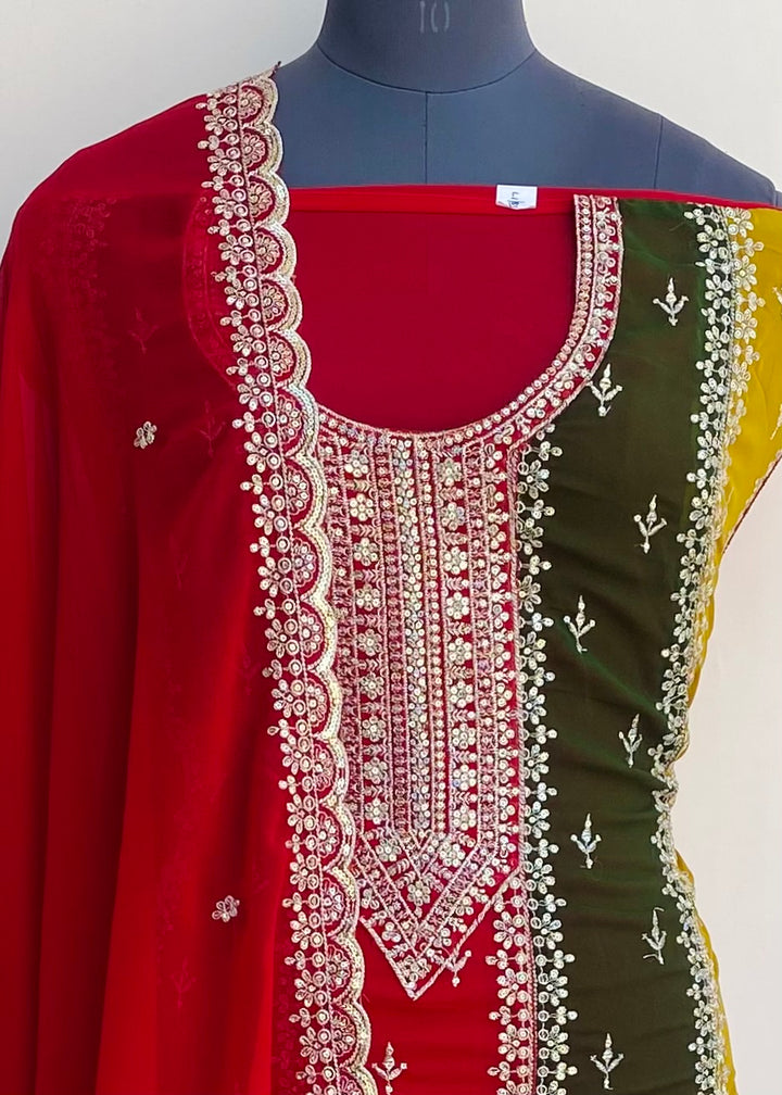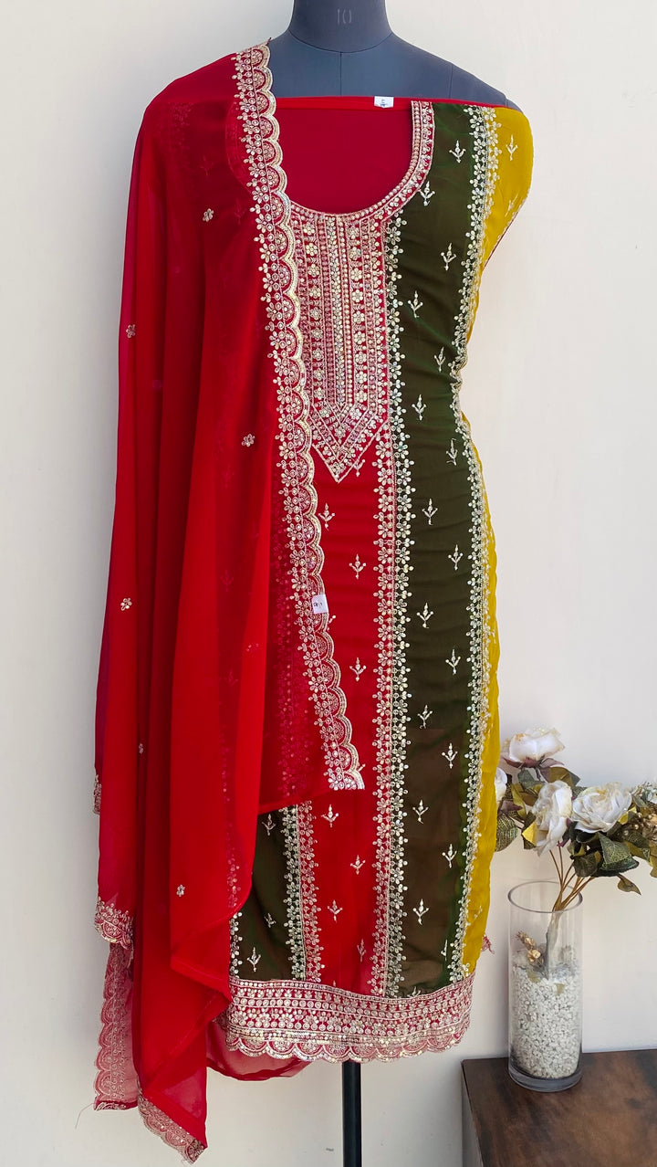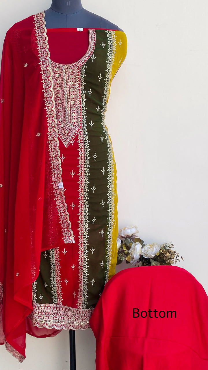 Designer Embroidered Suit Length 3 Piece Multicolour Georgette With Sequence Work With Embroidered Georgette Dupatta & Red Colour Cotton Bottom