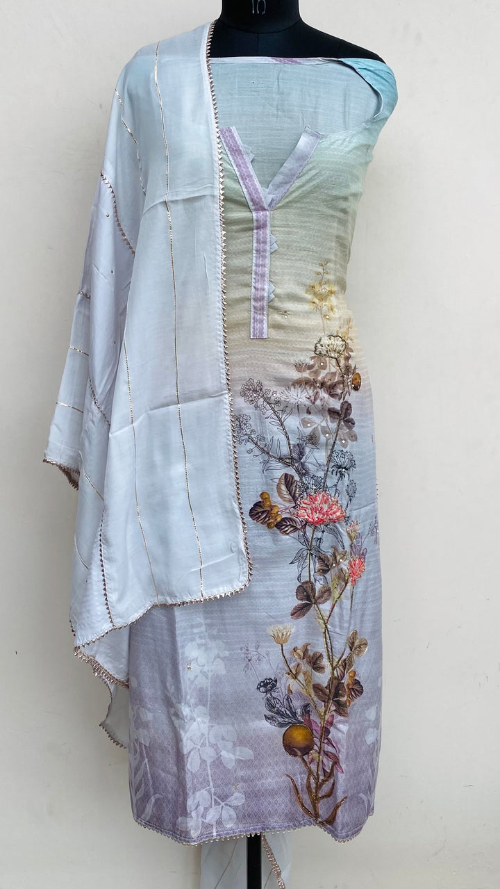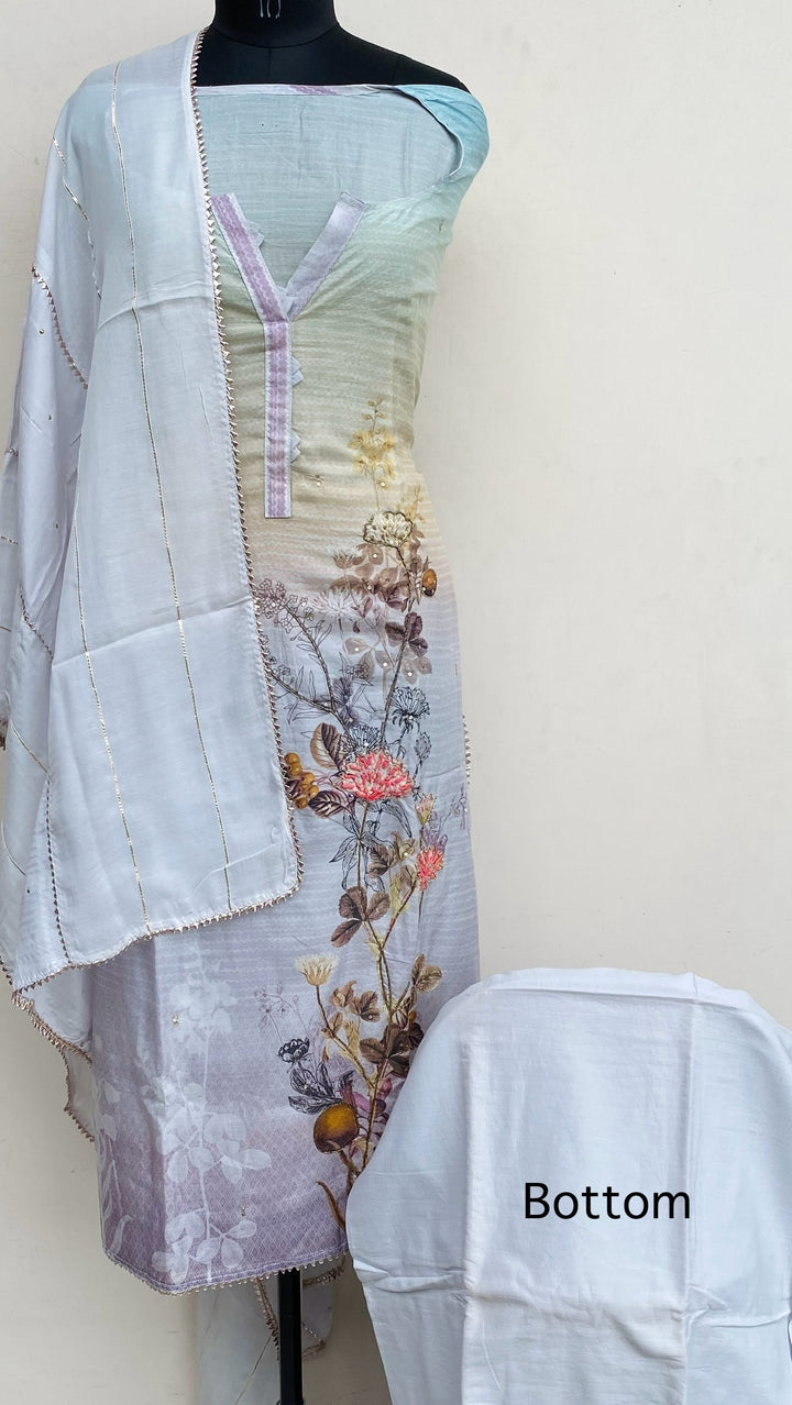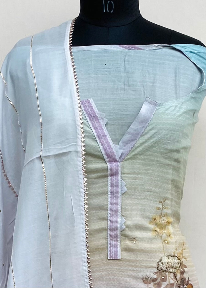 Designer Embroidered Suit Length 3 Piece Multicolour Muslin Cotton With Cutdana & Sequence Work With Embroidered Muslin Dupatta & Gray Colour Cotton Bottom
