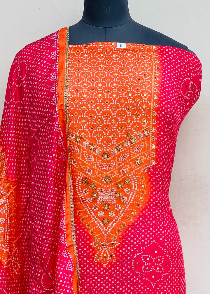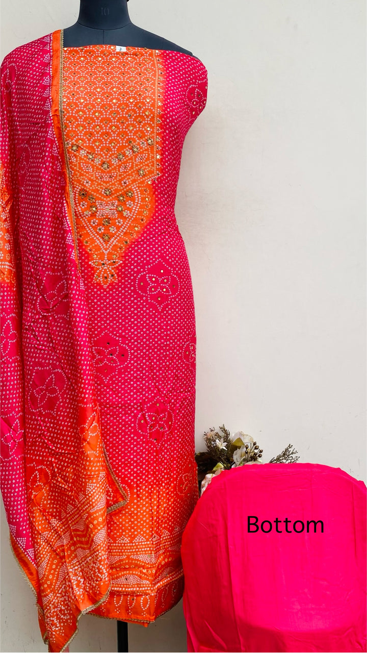 Designer Embroidered Suit Length 3 Piece Multicolour Muslin Cotton With Mirror & Stone Work With Printed Muslin Dupatta & Pink Colour Cotton Bottom
